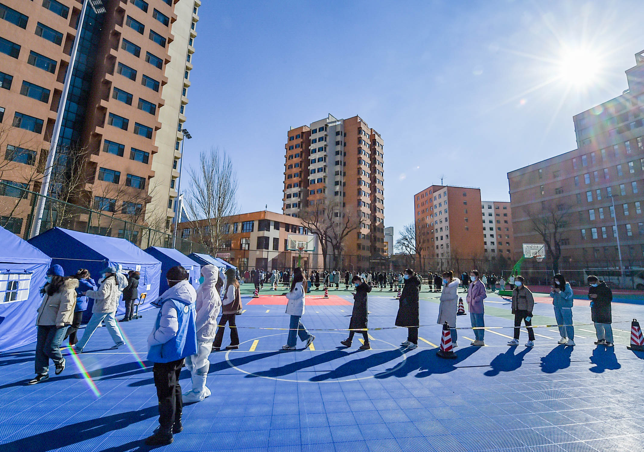 3月2日,内蒙古医科大学学生在校园内排队做核酸检测。新华社记者彭源 摄