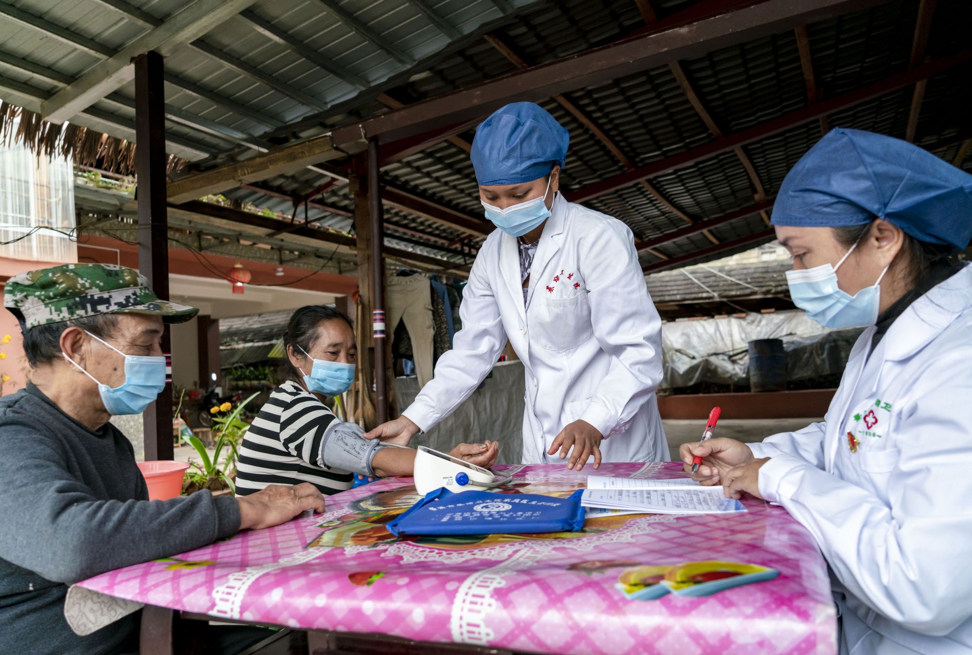 云南省西双版纳傣族自治州景洪市基诺山基诺族乡卫生院的家庭医生为基诺族老年人检查身体(2021年12月13日摄)。(新华社记者陈欣波摄)
