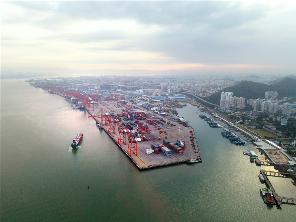 在福建自贸区厦门片区东渡港区,一艘货轮向码头靠拢(2017年8月26日摄,无人机照片)。新华社记者 姜克红 摄