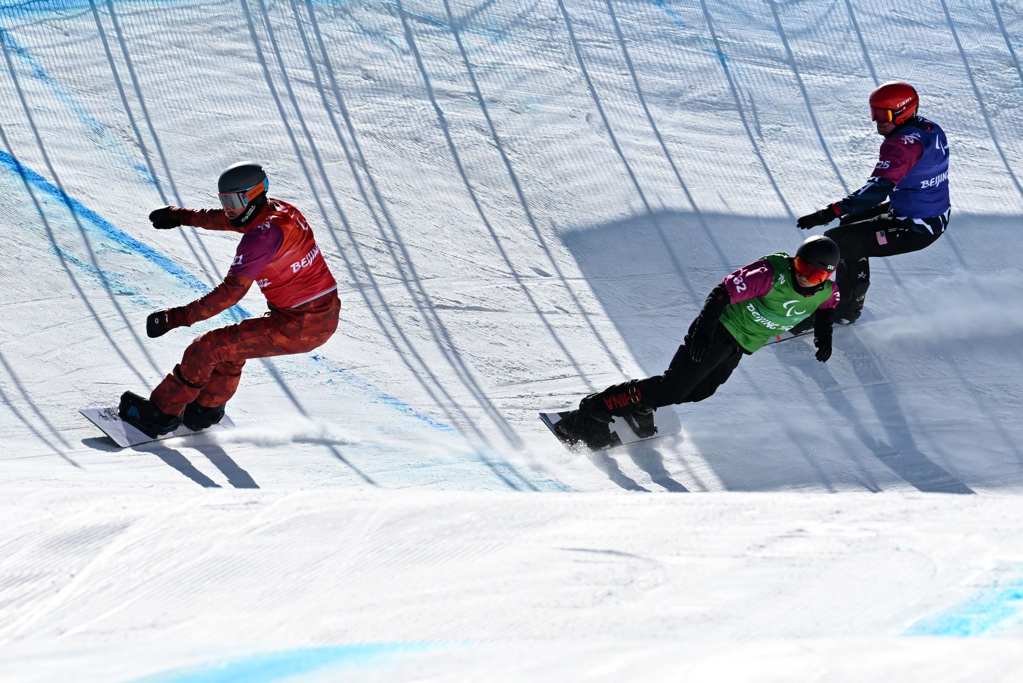 3月7日,中国选手武中伟(中)在北京冬残奥会单板滑雪男子障碍追逐LL1级比赛中,最终他获得季军。新华社记者宋彦桦摄