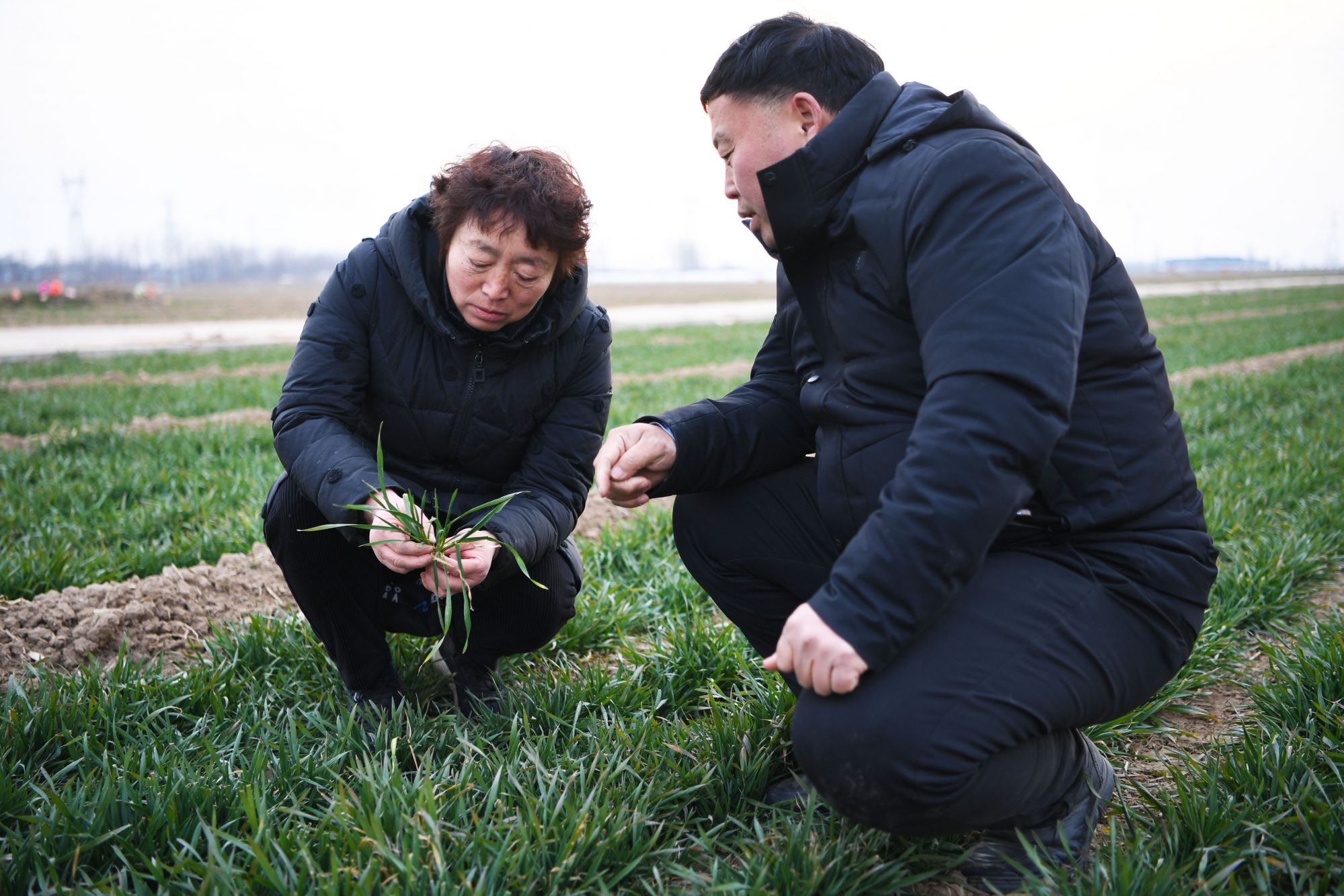 2月22日,河南省滑县农业技术推广中心研究员张心玲(左)和焕永种植农民专业合作社负责人杜焕永在查看苗情。新华社记者张浩然 摄