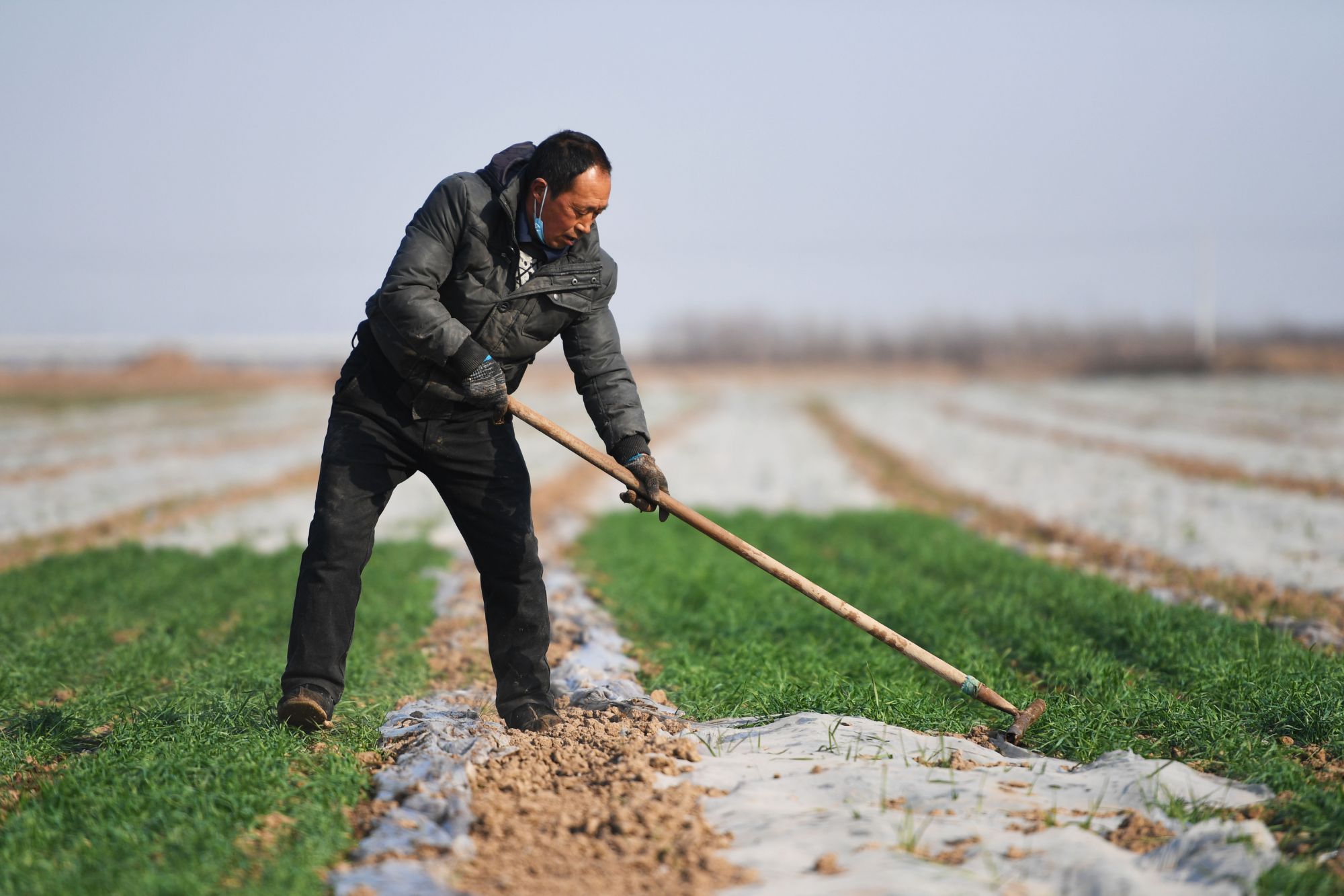 2月23日,由于气温回升,河南省滑县小铺乡界河路村的村民正在春管,揭掉部分麦田的地膜。新华社记者张浩然摄
