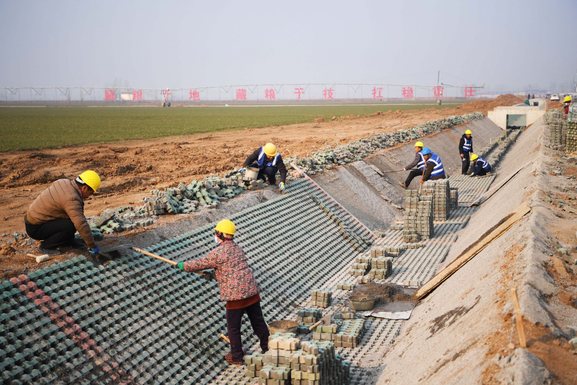 2月24日,河南省鹤壁市浚县30万亩高标准农田示范方内,施工人员正在忙着修复去年水毁的沟渠。新华社记者张浩然 摄