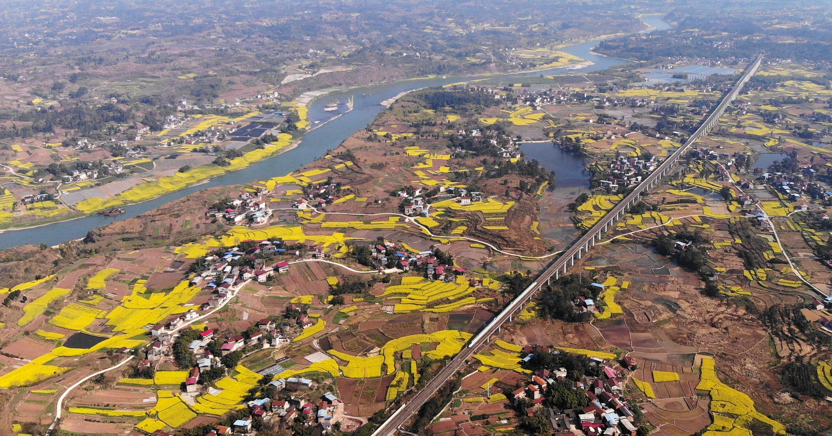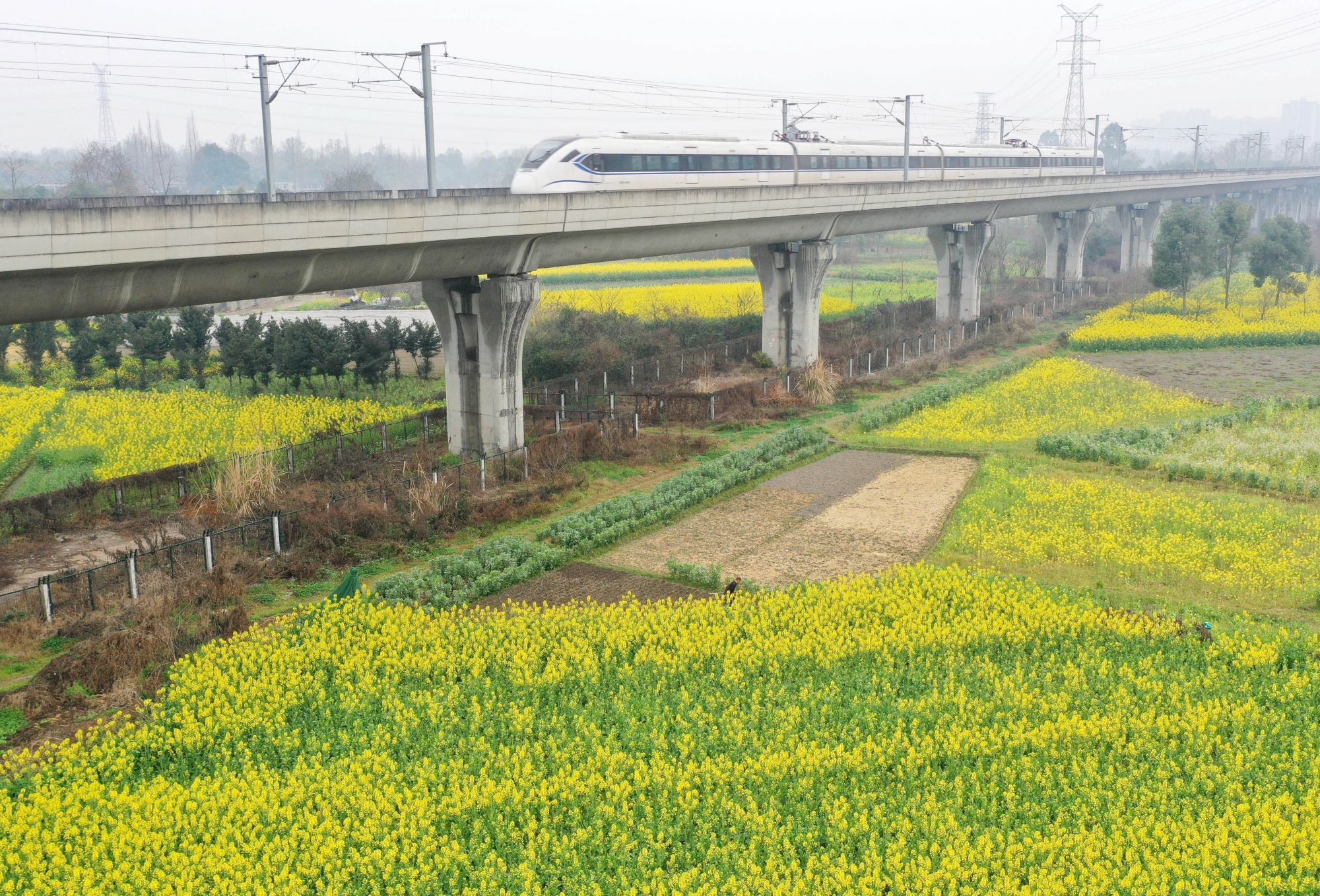 ↑3月6日,动车组列车从四川省彭州市连封村油菜花田旁驶过(无人机照片)。新华社发(罗国杨摄)