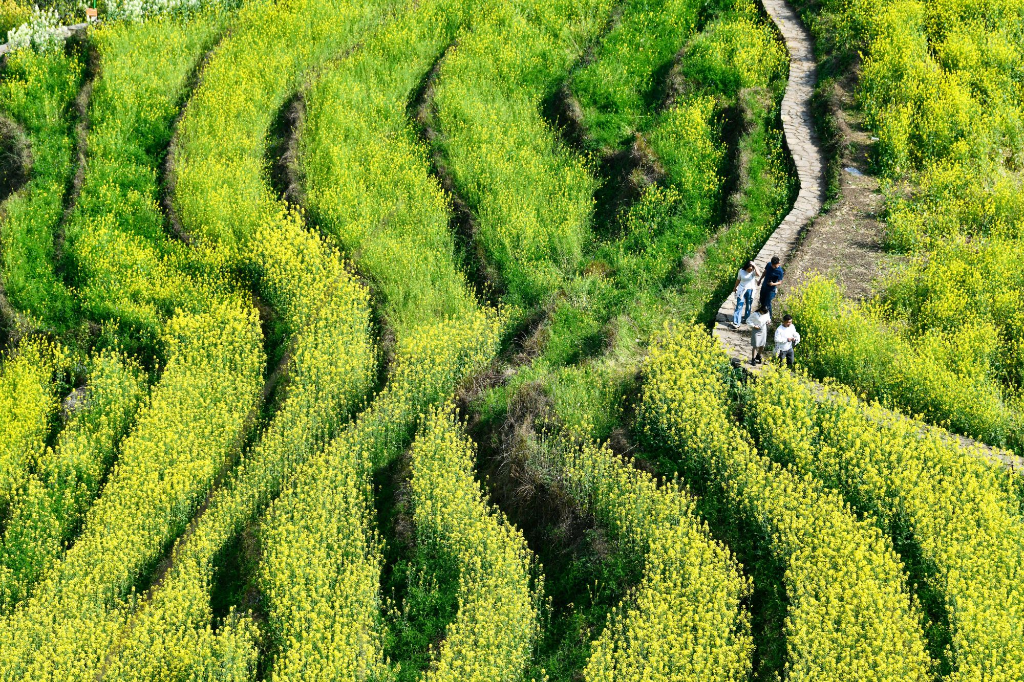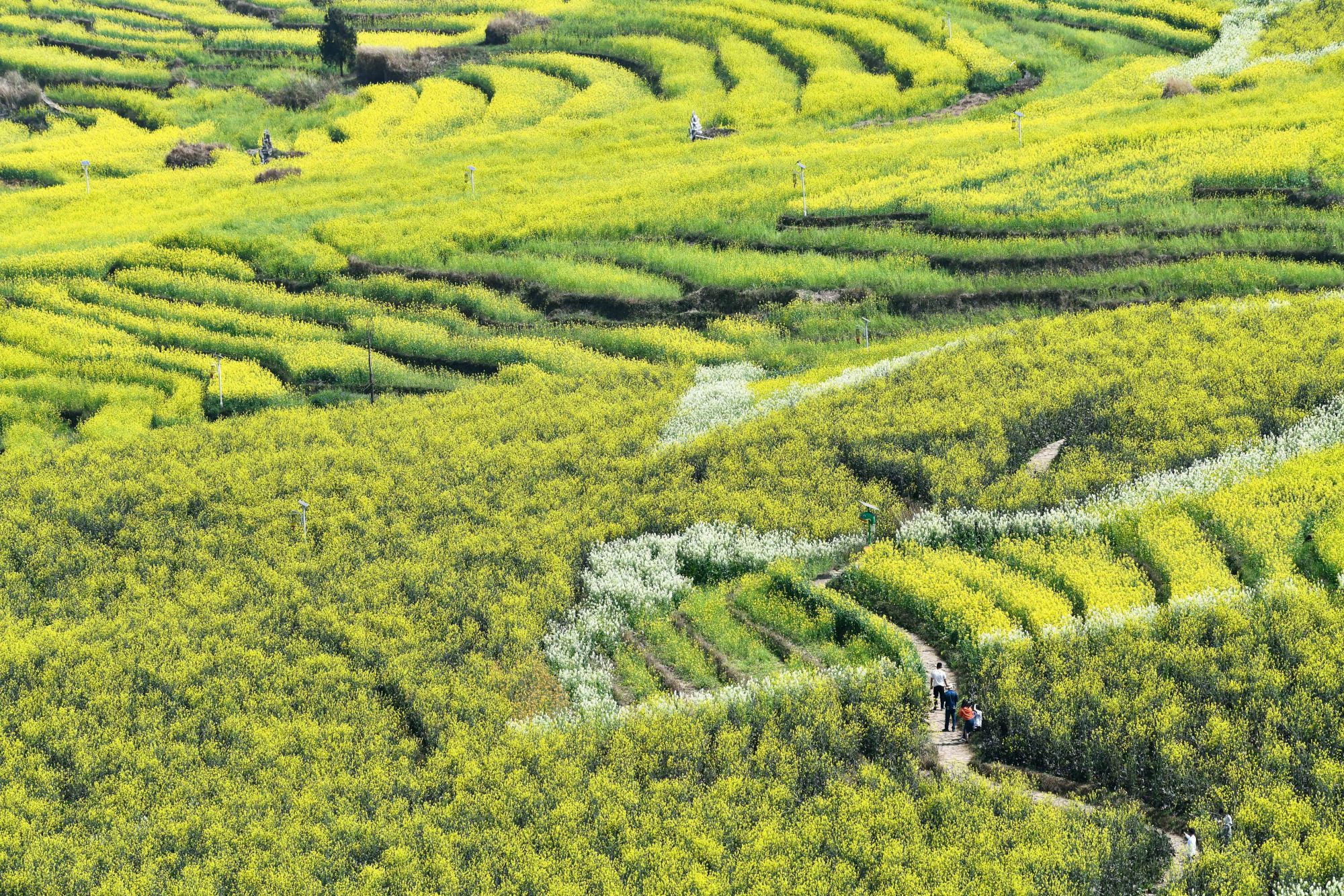 ↑3月7日,人们在贵州省盘州市新民镇旧屯村油菜花田赏花。新华社记者 杨文斌 摄