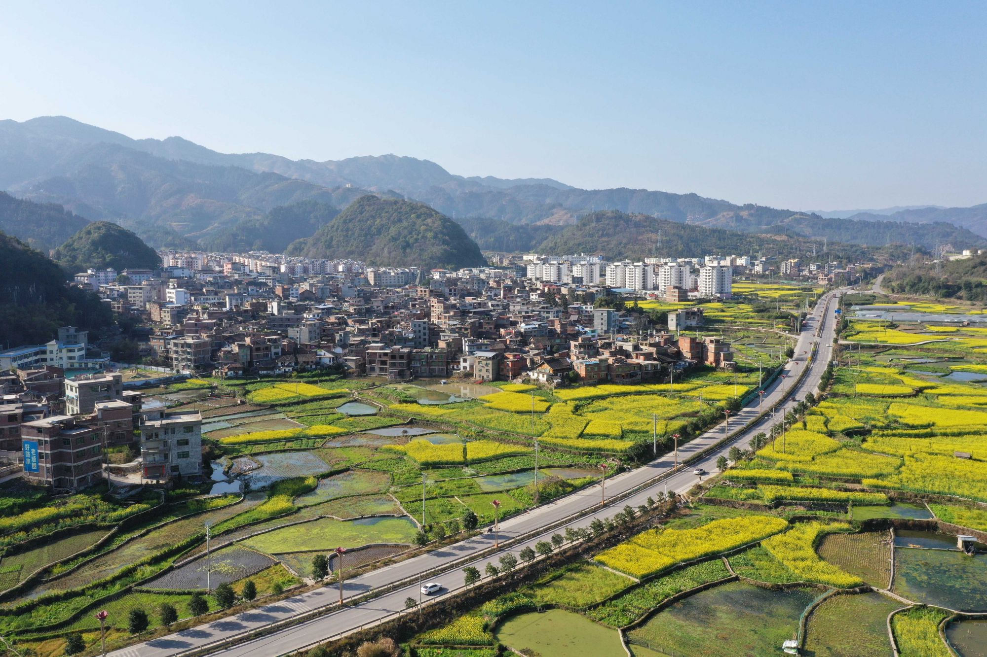↑在贵州省从江县贯洞镇,乡村公路两边的油菜花竞相绽放(3月7日摄,无人机照片)。新华社发(吴德军摄)