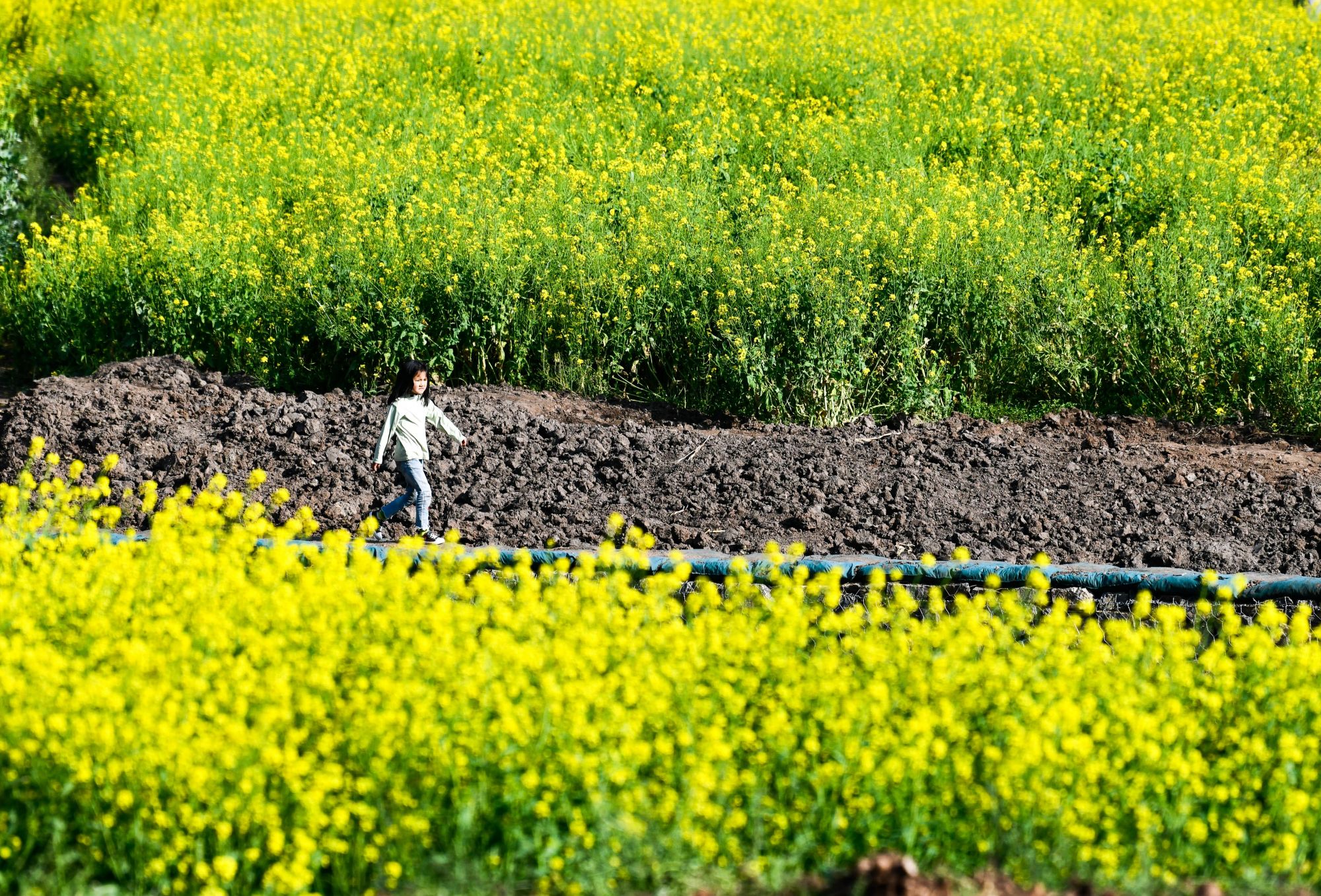 ↑3月7日,小朋友在贵州省盘州市保田镇甘河村的油菜花田边游玩。新华社记者 杨文斌 摄