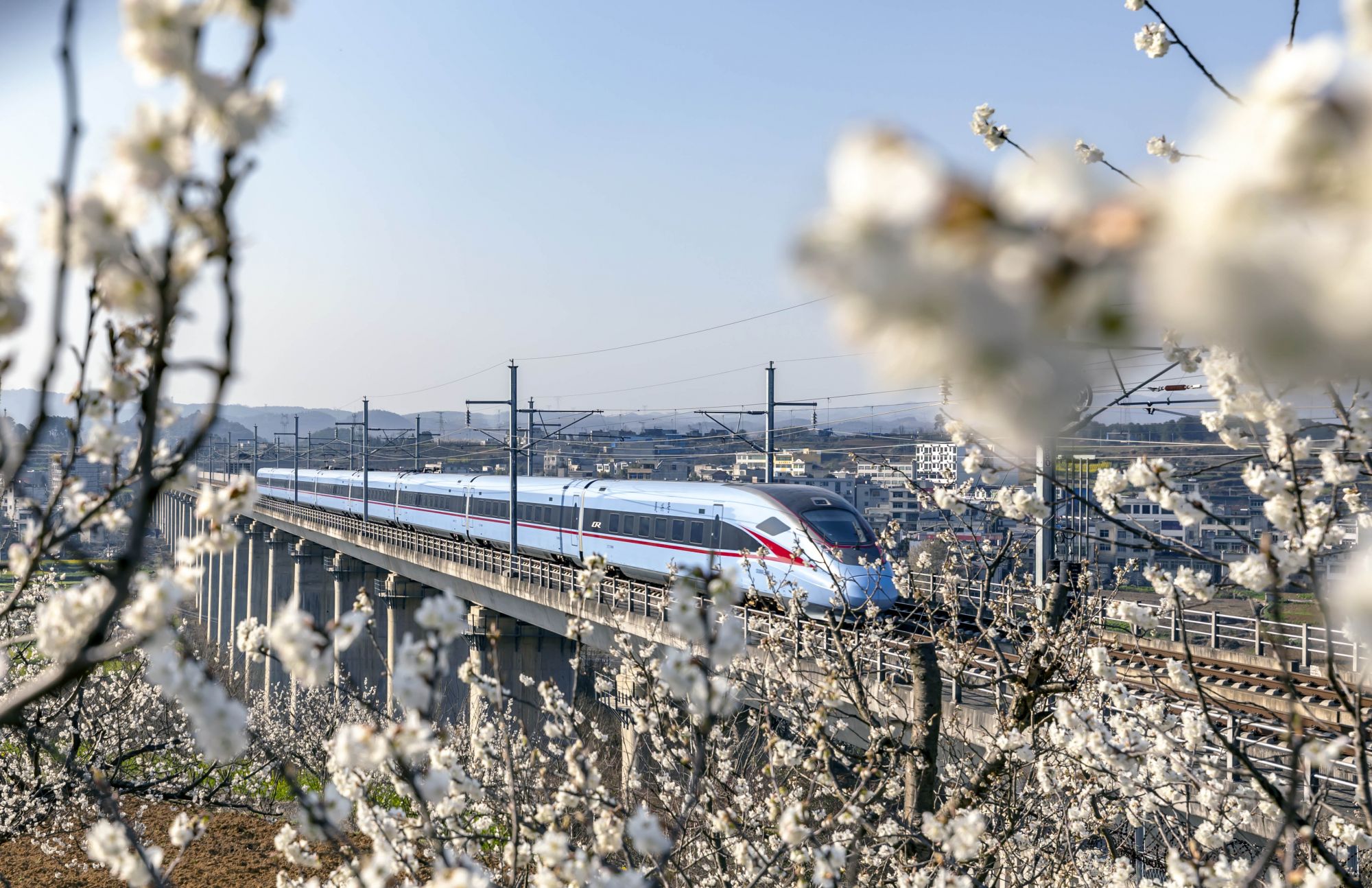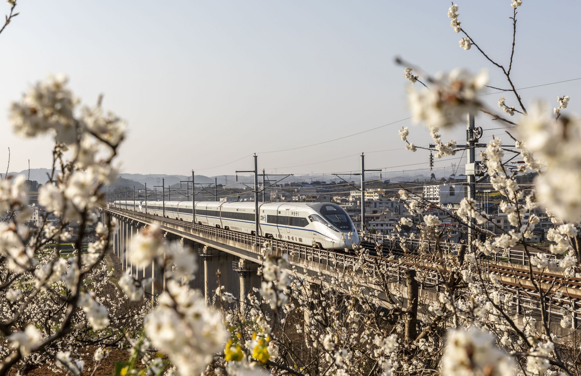 ↑3月7日,动车组列车在成贵高铁贵州黔西段行驶。新华社发(范晖 摄)