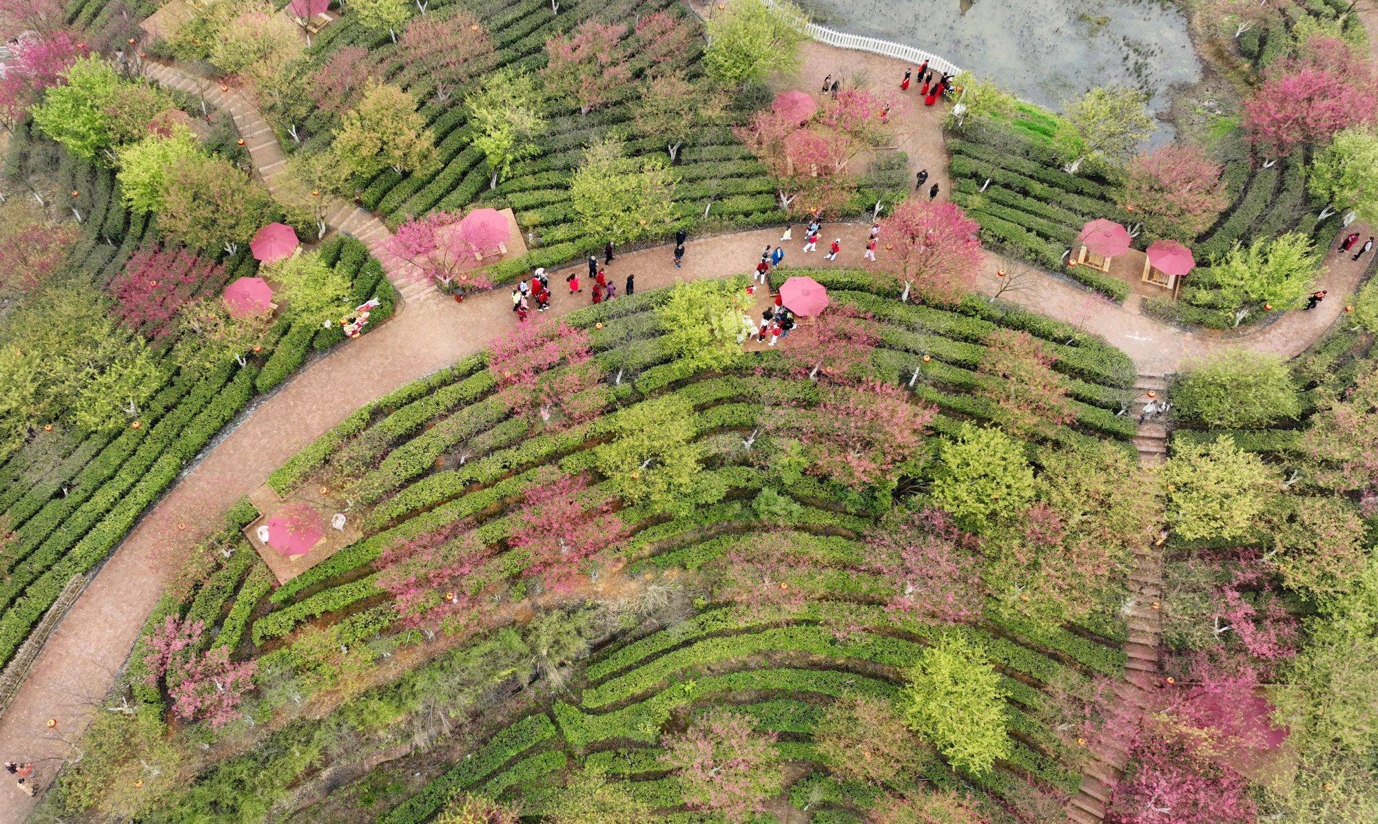 ↑3月5日,游客在湖南省郴州市苏仙区高椅岭茶园踏青赏花(无人机照片)。新华社发(曹正平摄)
