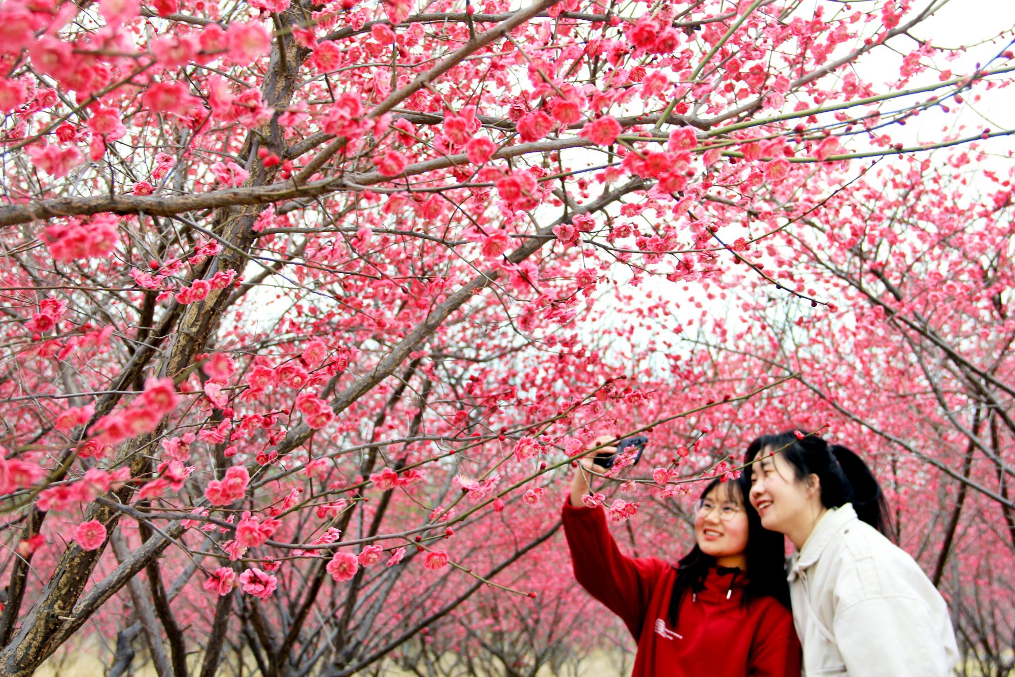 ↑3月6日,在安徽省淮北市南湖风景区,人们在梅花园赏花游玩。新华社发(周方玲摄)