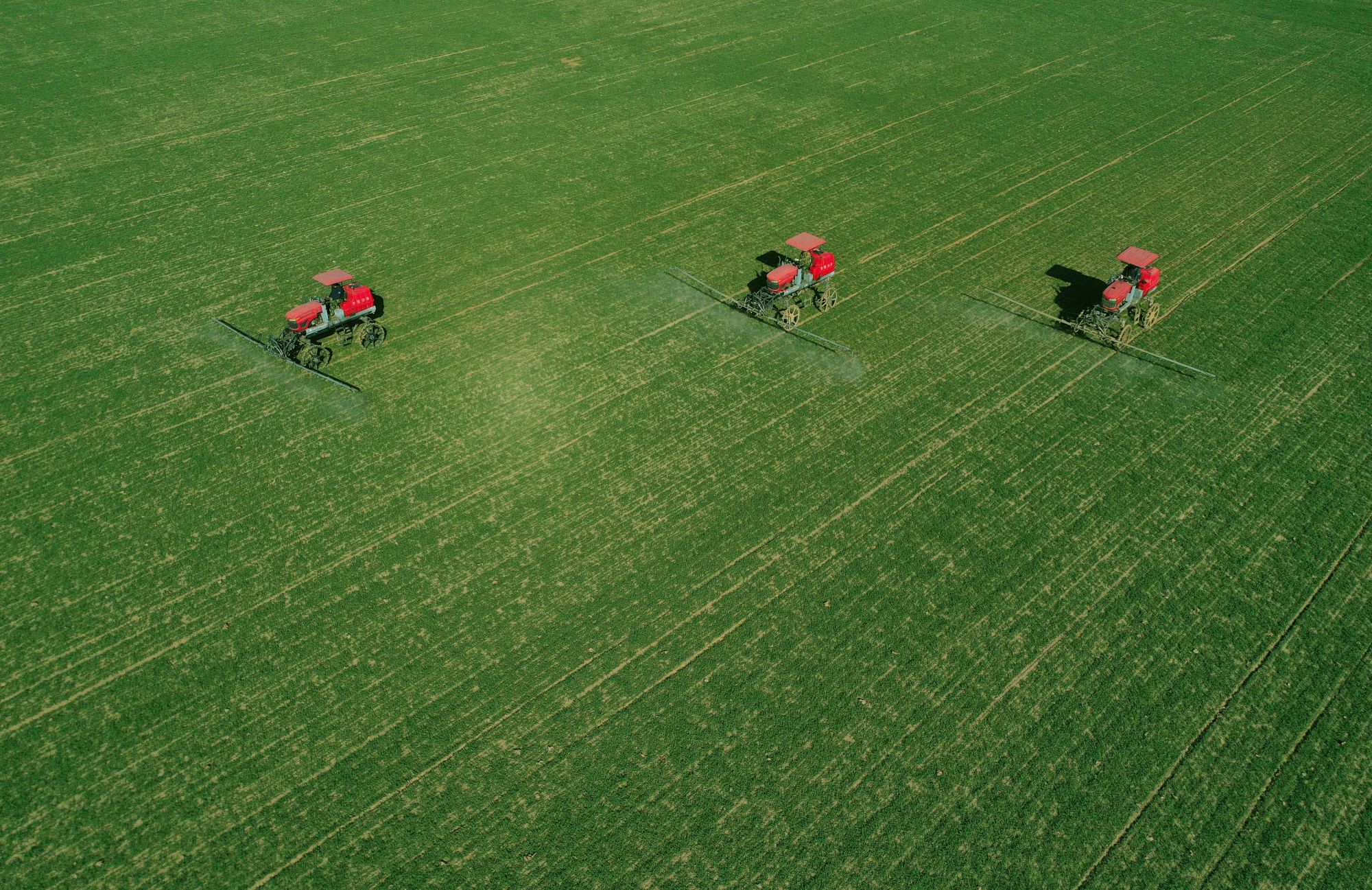 ↑3月7日,农机在河北省邢台市南和区阎里乡的麦田开展春管作业(无人机照片)。新华社记者 朱旭东 摄