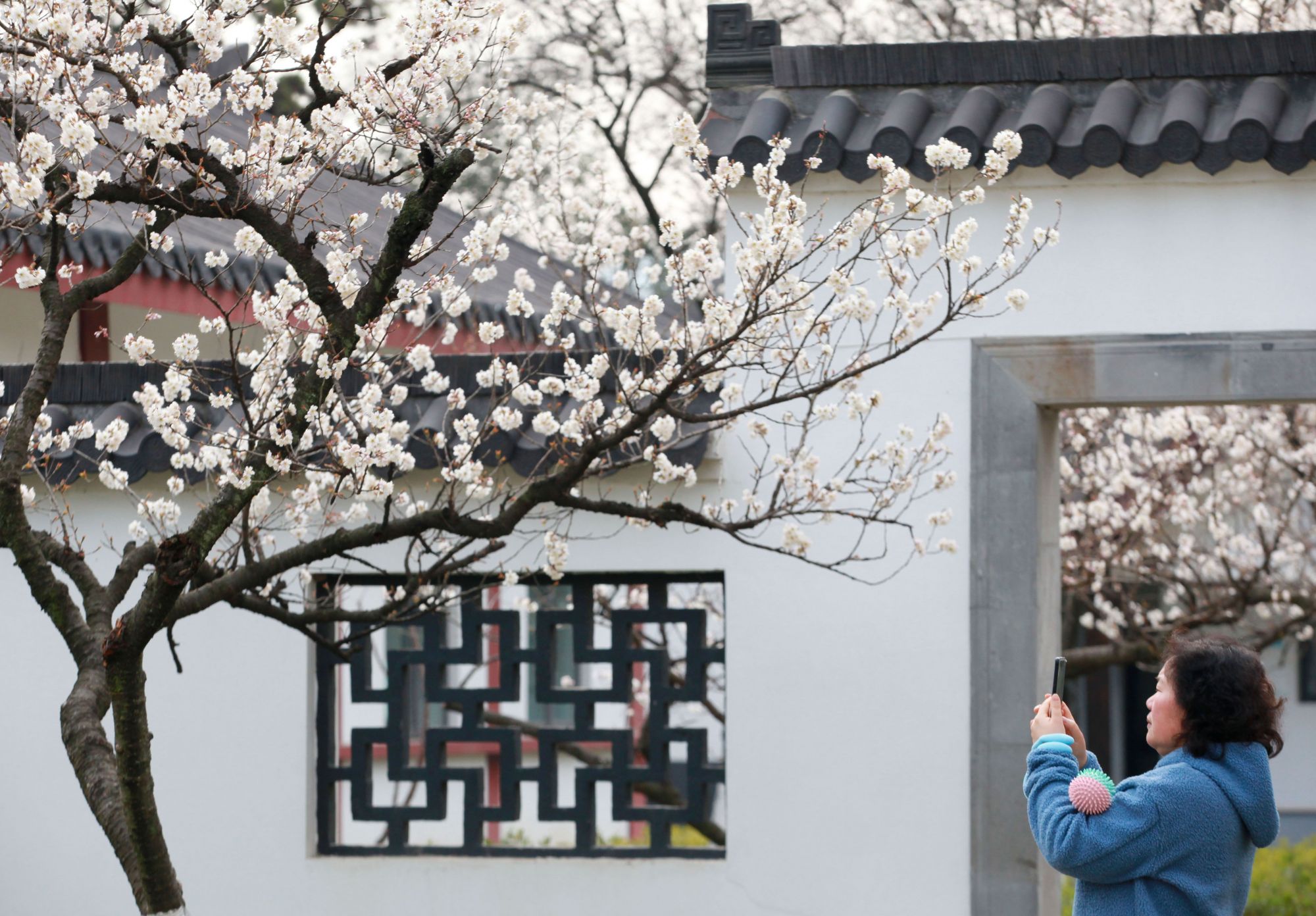 ↑3月6日,游人在南京中山植物园赏花。新华社发(苏阳摄)