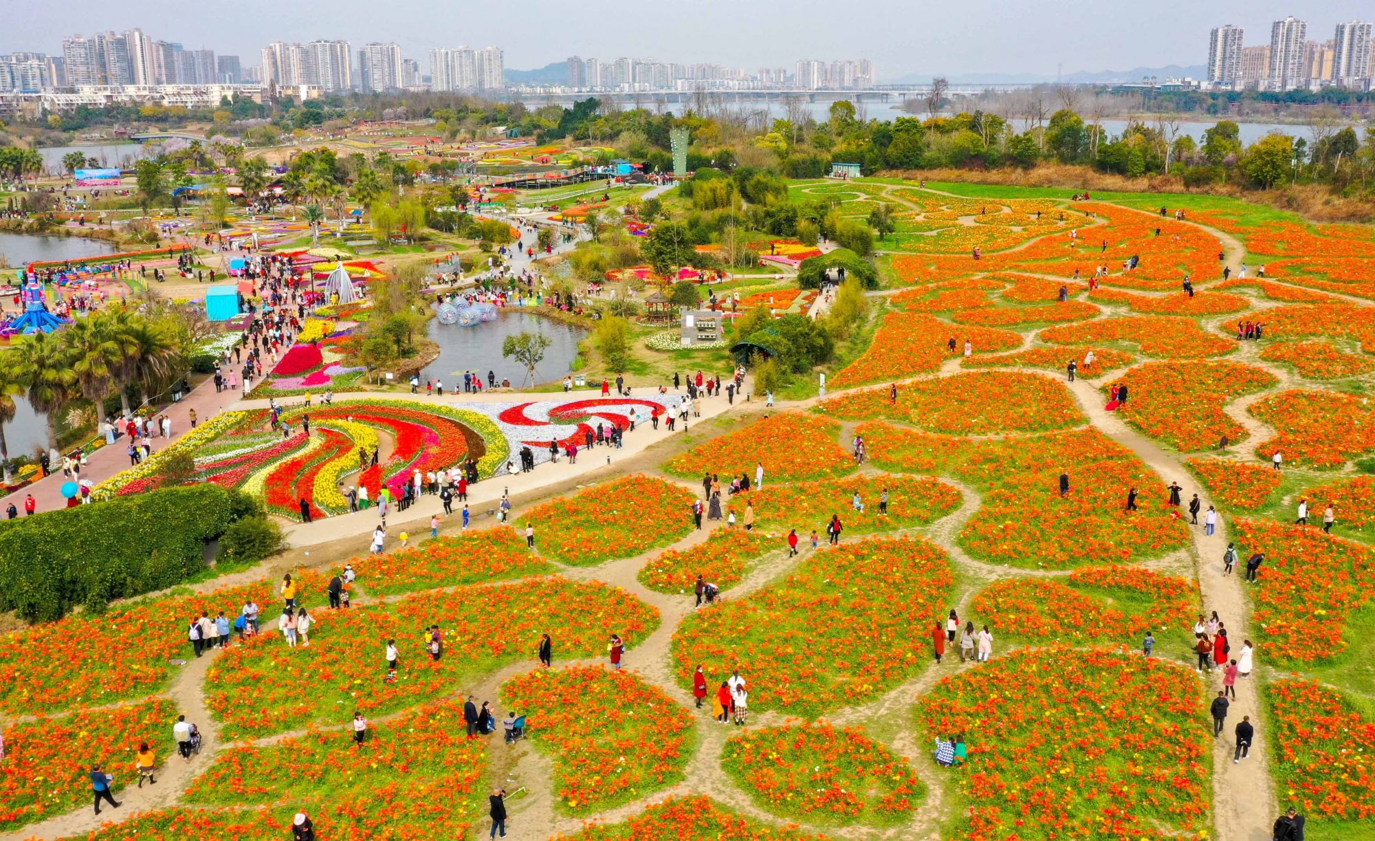 ↑3月6日,四川省遂宁市圣莲花开景区的鲜花开放,吸引游客前来踏青赏花(无人机照片)。新华社发(刘昌松摄)