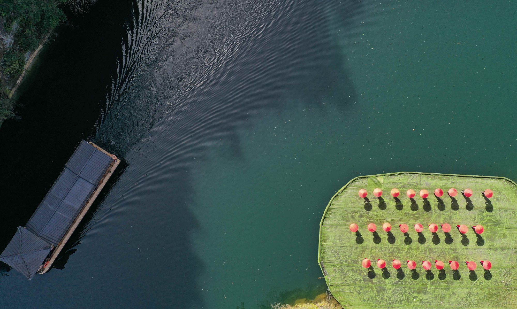 ↑3月7日,游船行驶在张家界市武陵源区宝峰湖景区水面上(无人机照片)。新华社发(吴勇兵摄)