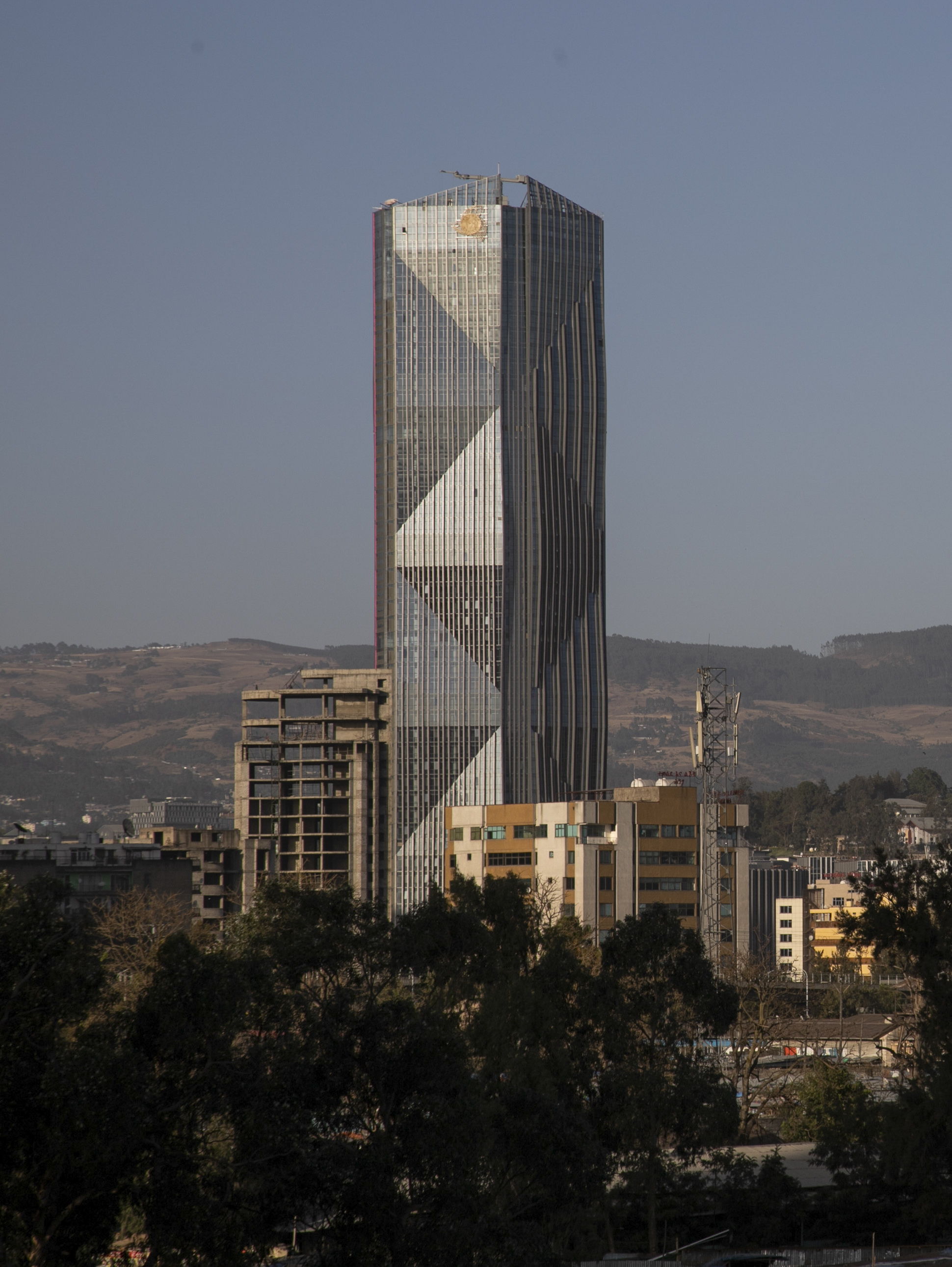 这是2022年2月13日拍摄的位于亚的斯亚贝巴的埃塞俄比亚商业银行新总部大楼。由中企承建的东非最高建筑埃塞俄比亚商业银行新总部大楼13日正式竣工。(新华社记者汪平摄)