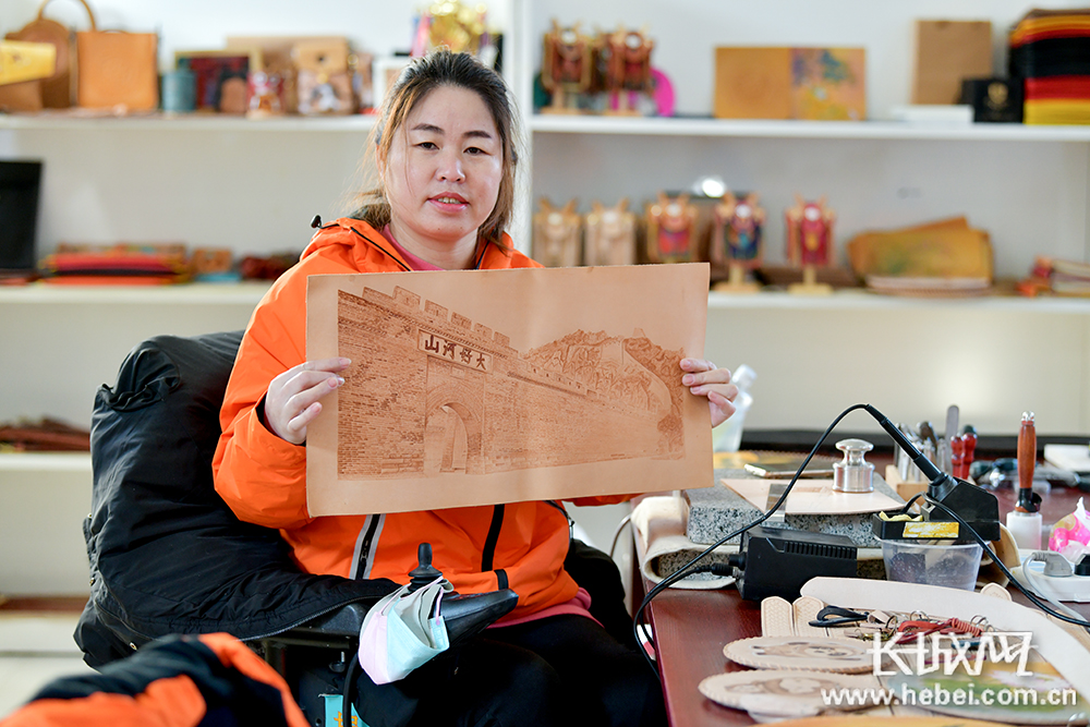 在工作区,一位正埋头勾勒皮烫画细节的大姐吸引了记者的注意,她告诉记者:“我叫郑树果,今年43岁,原本经营服装生意,但2010年的一场车祸让我的下半身失去了知觉,也让我失去了往日的开朗与活力。在家人的劝导、陪伴和时间的缓冲下,我终于开始重新审视自己的人生,既然还拥有余生,那么我就不能让它就这样空寂。”