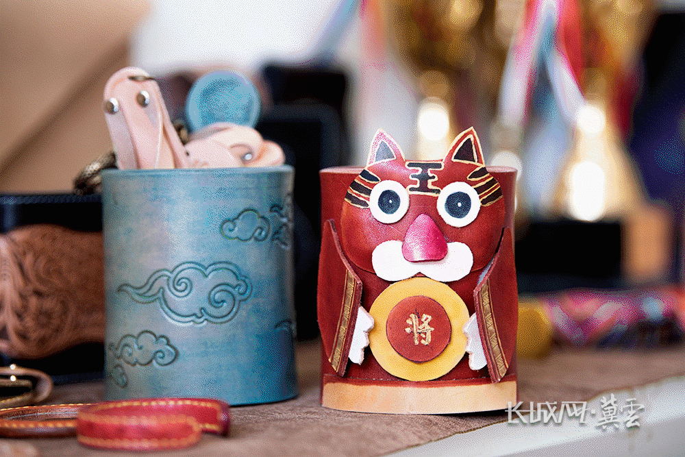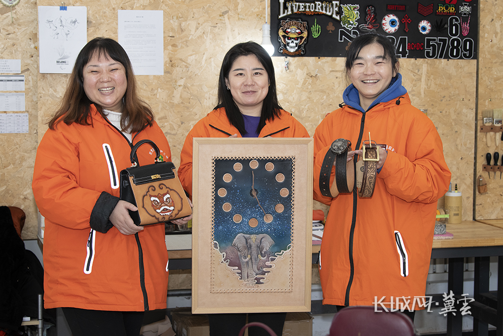 喻晓燕、许晓男、相灿灿展示自己做的皮具作品。长城网·冀云客户端记者 许付磊 摄