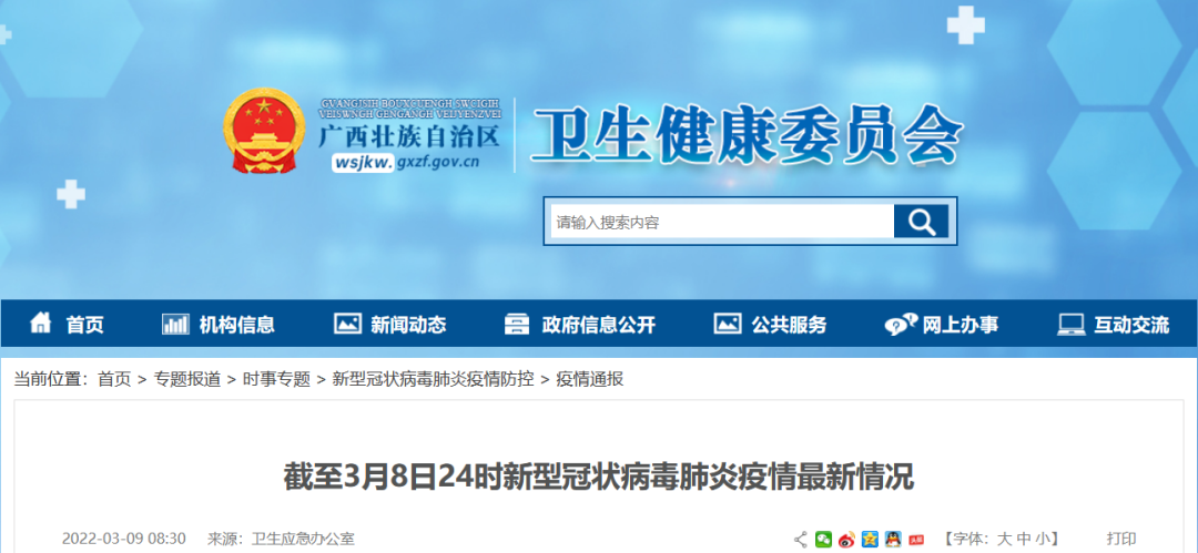 3月8日0-24时,我区无新增本土确诊病例,新增本土无症状感染者4例(防城港市2例,百色市1例,崇左市1例)。当日治愈出院本土确诊病例40例(百色市39例,防城港市1例)。截至3月8日24时,全区现有93例本土确诊病例(百色市41例,南宁市1例,防城港市50例,崇左市1例),本土无症状感染者39例(防城港市27例,百色市11例,崇左市1例)。