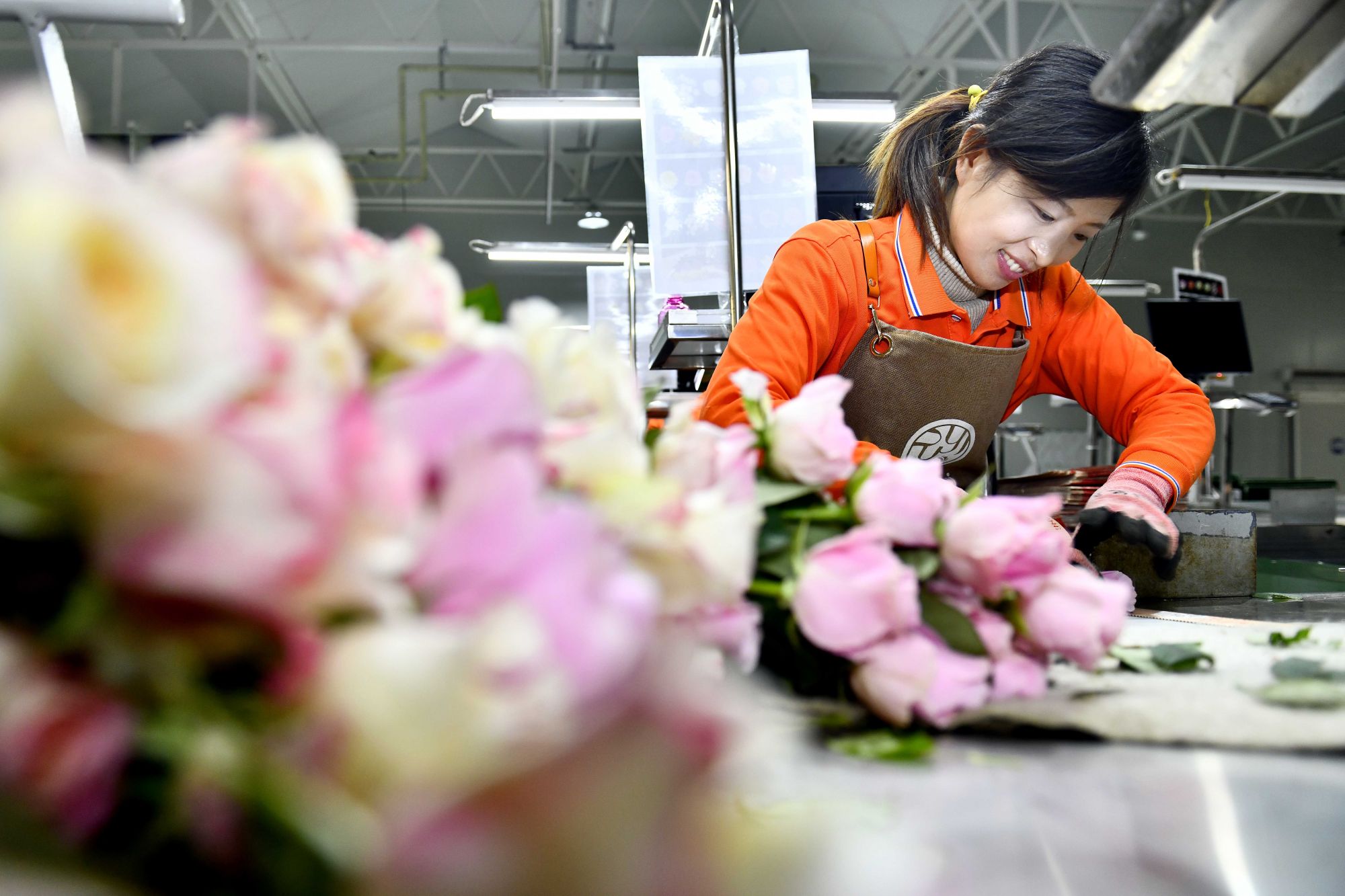 在山东省莒县招贤曲坊现代农业产业园玫瑰基地,工作人员在包装玫瑰。新华社记者郭绪雷 摄