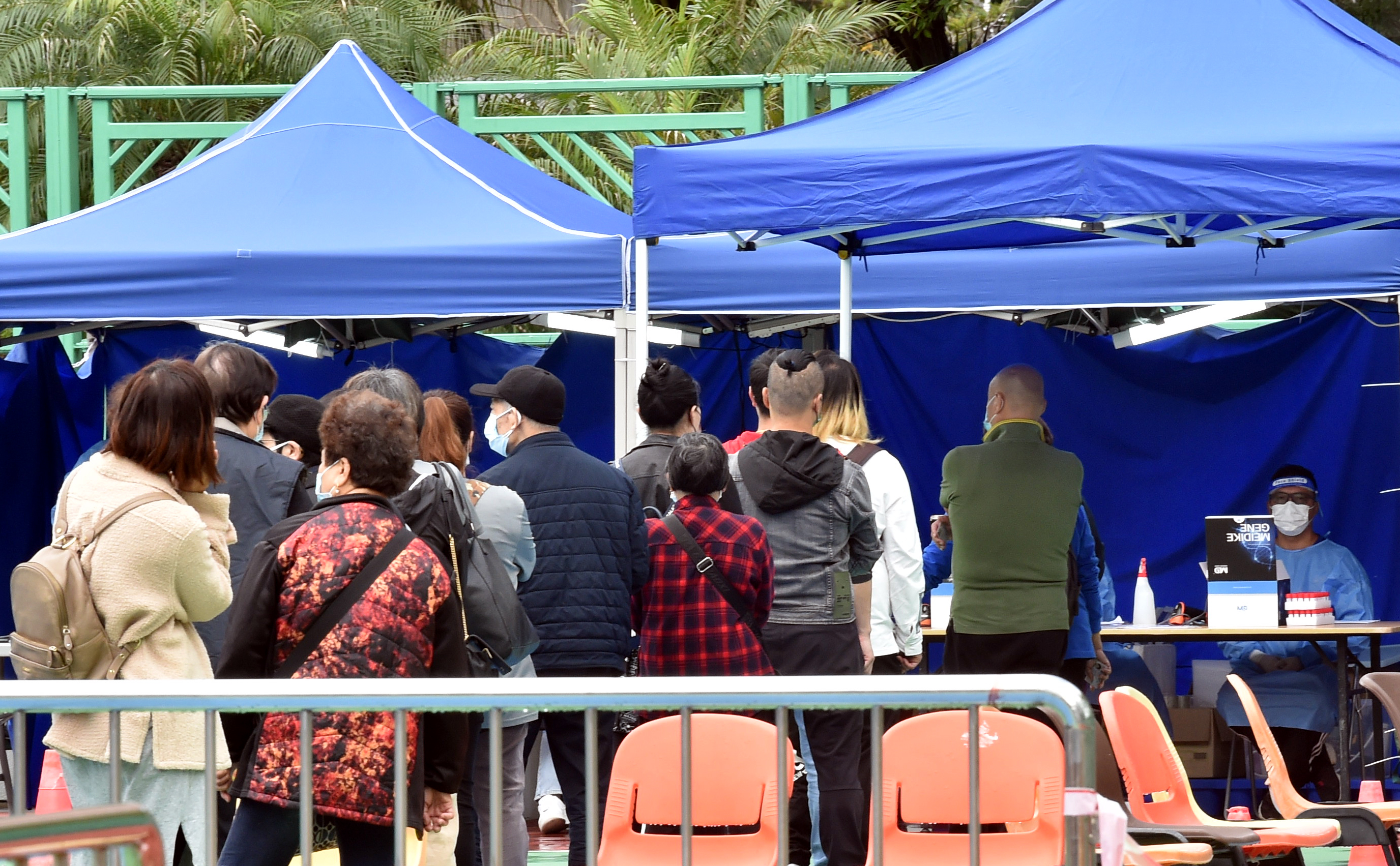 3月7日,在香港马鞍山流动检测站,市民戴口罩排队做核酸检测。新华社记者 卢炳辉 摄