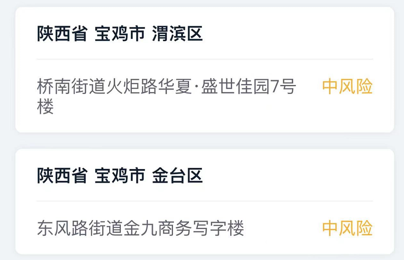 此前,宝鸡将渭滨区石鼓太阳市香辣蟹火锅店调整为高风险地区、渭滨区火炬路华夏盛世佳园7号楼调整为中风险地区。