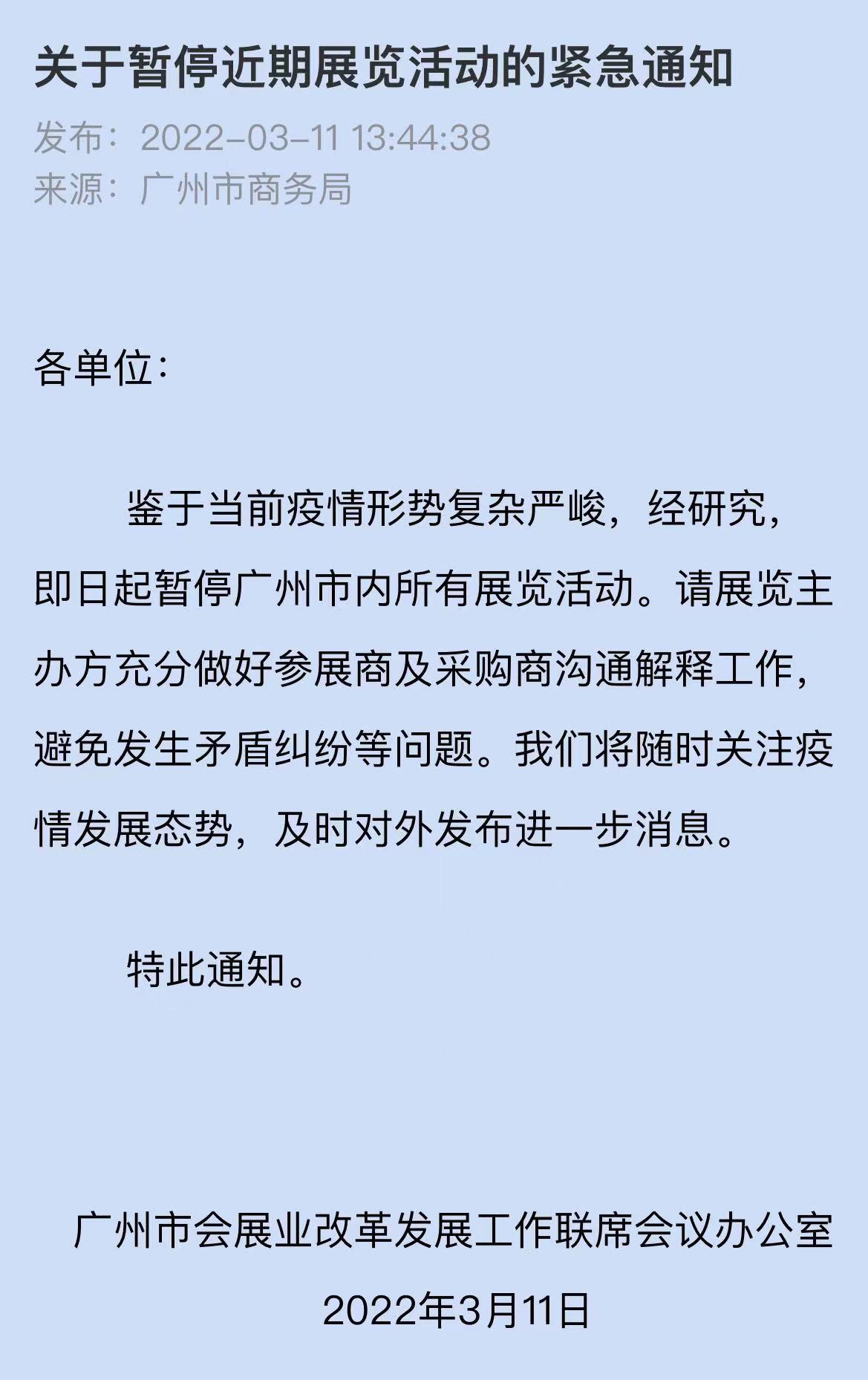 据广州市会展业改革发展工作联席会议办公室消息,鉴于当前疫情形势复杂严峻,经研究,即日(3月11日)起暂停广州市内所有展览活动,请展览主办方充分做好参展商及采购商沟通解释工作,避免发生矛盾纠纷等问题。