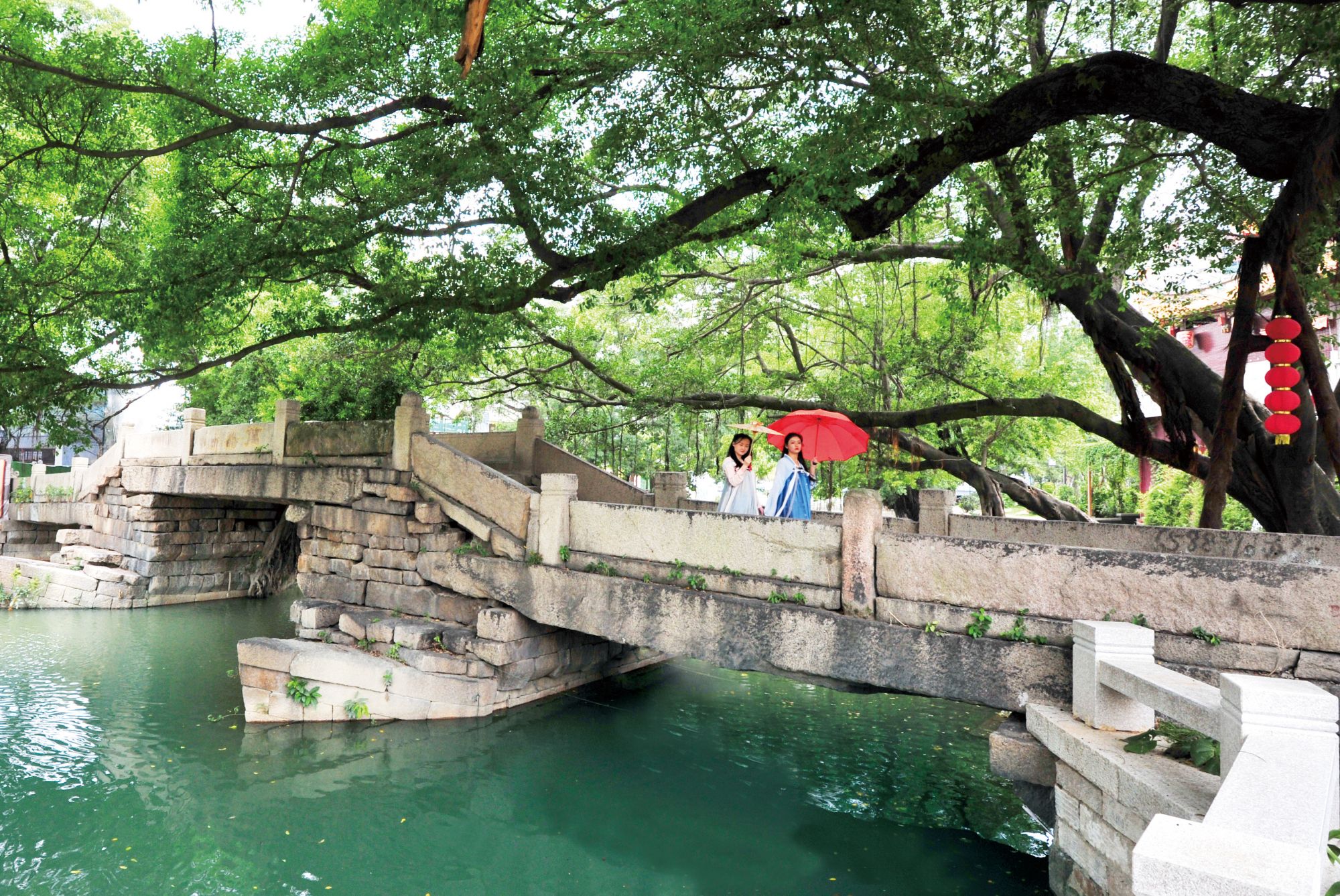 2021年10月7日,游客行走在福州市台江区榕树荫蔽的万寿桥上。(福州市园林中心供图)