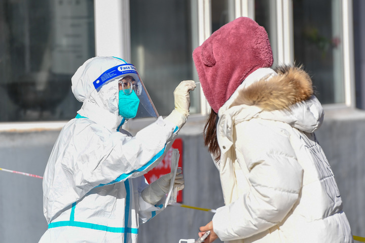 2022年3月11日,吉林市船营区大东街道一核酸检测采样点,工作人员为居民进行核酸检测采样。新华社记者张楠 摄