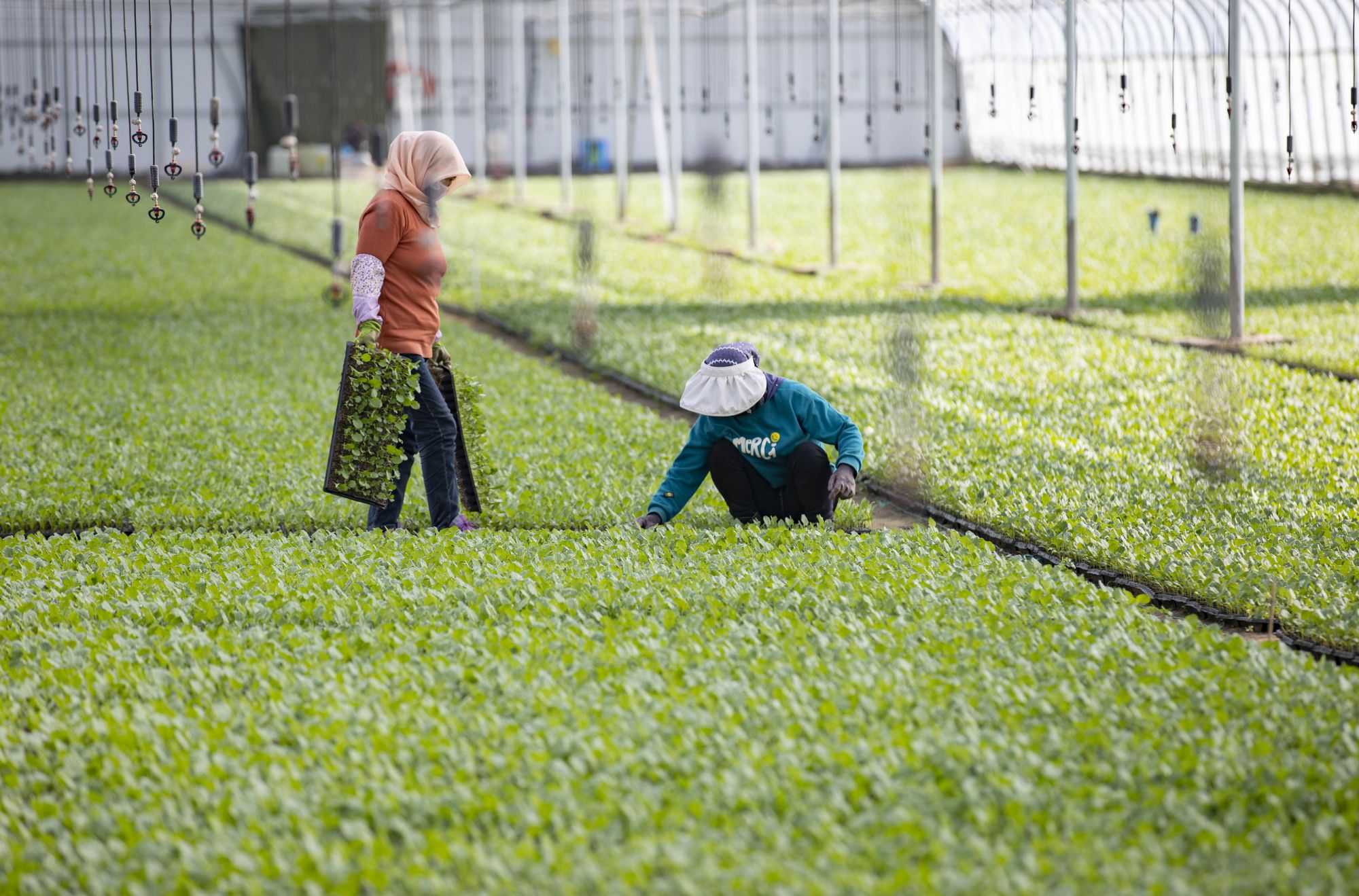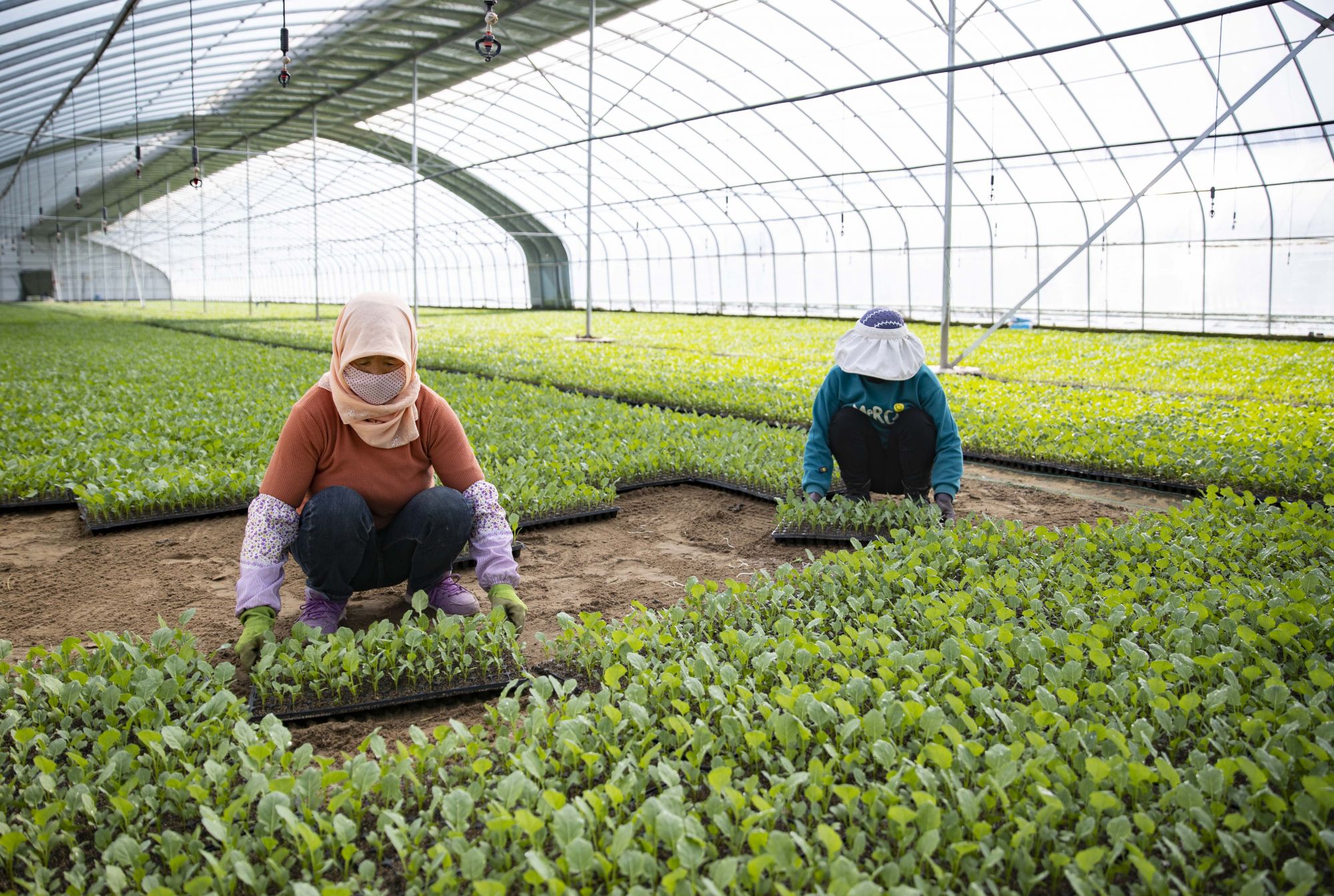 3月8日,农民在宁夏贺兰县隆源村的蔬菜种植园区育苗棚内劳作。