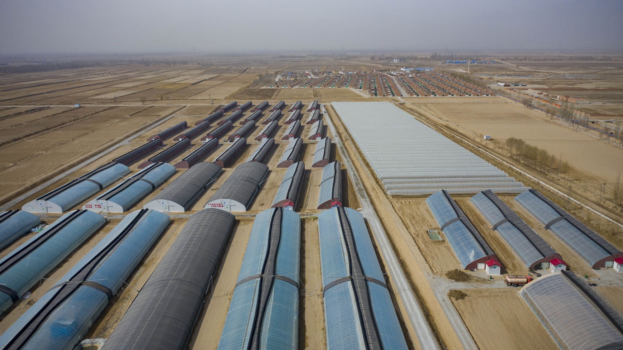 这是3月8日拍摄的宁夏贺兰县隆源村的蔬菜种植园区(无人机照片)。