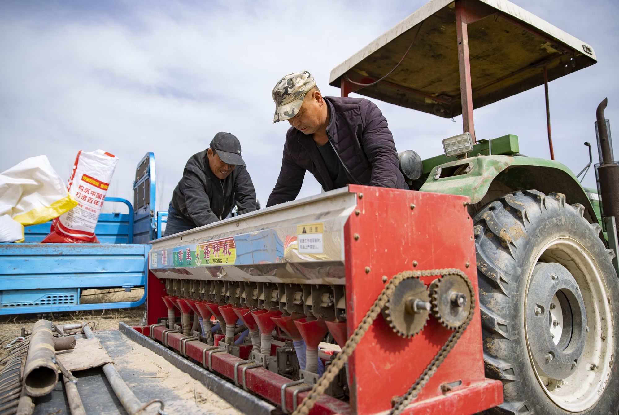 3月8日,在宁夏贺兰县隆源村,农民向自动播种机内添加小麦种子和化肥。
