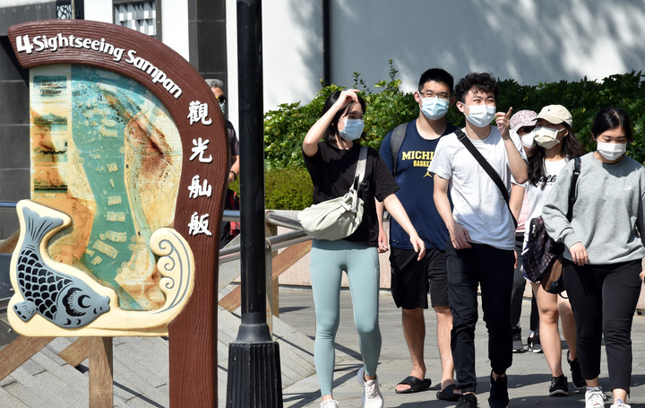 3月13日,在香港香港仔海滨长廊,市民佩戴口罩出行。新华社记者卢炳辉 摄