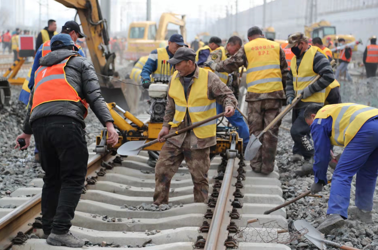 “我们要在两小时内,将京沪线上下行线路拨接到正位,随后进行大机捣固施工,施工内容为京沪线上下行线路拨接及大机捣固施工,共3个拨接口,拨线总长度384米、最大拨距7.6米,拆除既有线路115米,拆除临时护网2.7公里,要点施工时间紧、任务重、安全风险高。”中铁六局北京铁建公司副总经理于广涛介绍。