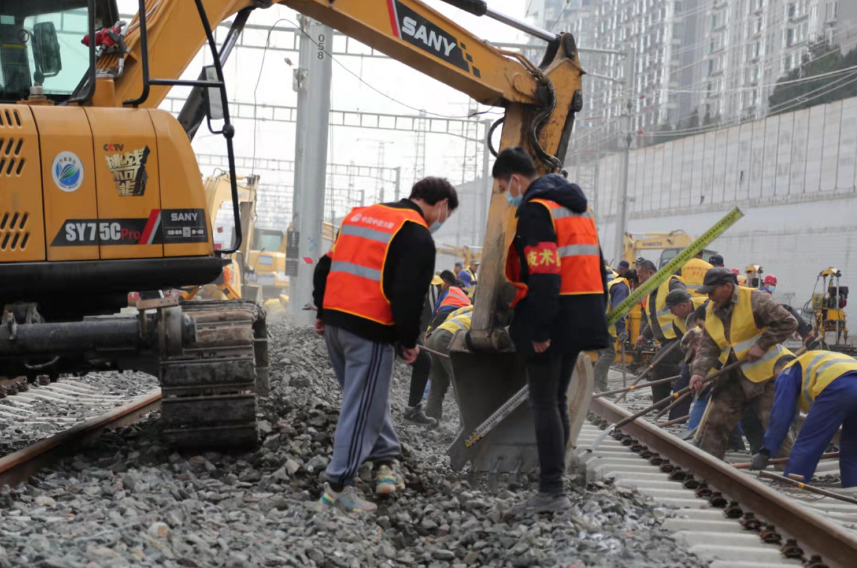 上午10点半,700余名工人进场,拆除铁轨旁护网,随后大型设备进场,启动拨线施工,场面热火朝天。不远处,可以看见崭新的丰台站站房。
