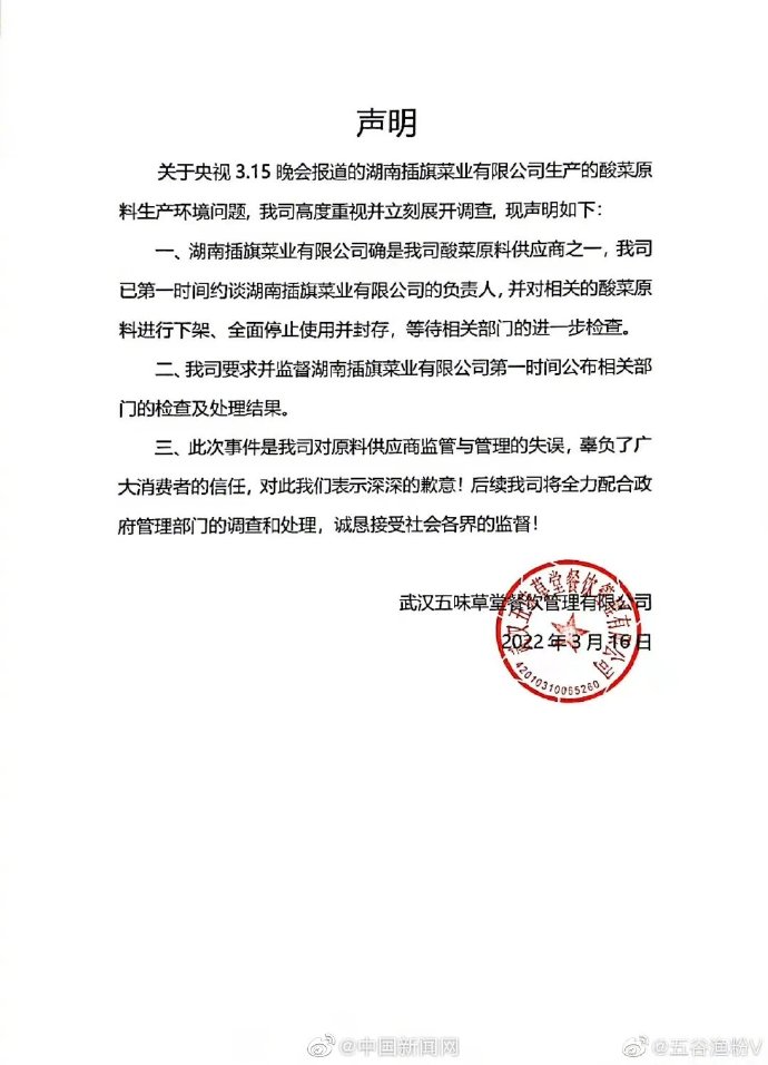 16日,针对“3.15”晚会报道的老坛酸菜食品安全问题,五谷渔粉声明表示,湖南插旗菜业有限公司确是其酸菜原料供应商之一,已第一时间约谈插旗菜业负责人,并对相关酸菜原料进行下架,全面停止使用并封存,等待相关部门的进一步检查。五谷渔粉称,此次事件是我司对原料供应商监管与管理的失误,辜负了广大消费者的信任,对此我们表示深深的歉意。