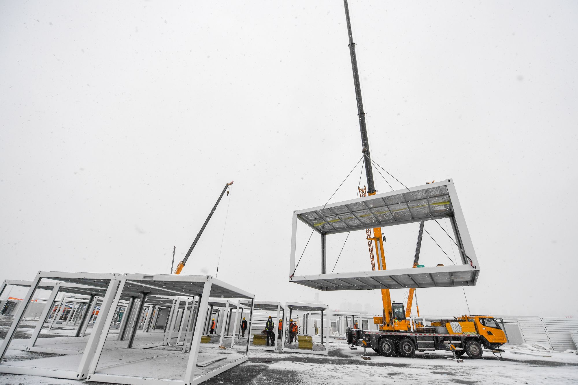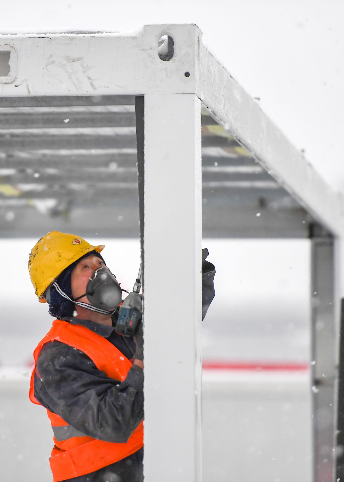 硕大的雪片纷纷扬扬洒落,位于吉林市高新区的隔离方舱施工现场泥泞不堪。