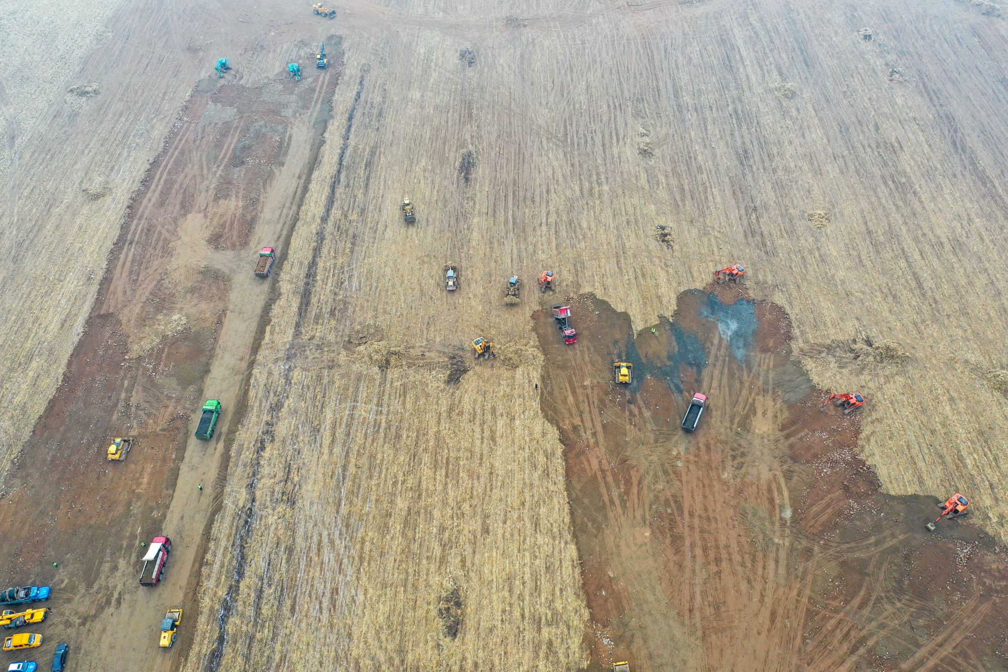 3月16日拍摄的吉林长春兴隆山保税区方舱隔离点一期施工现场(无人机照片)。新华社发(张扬摄)