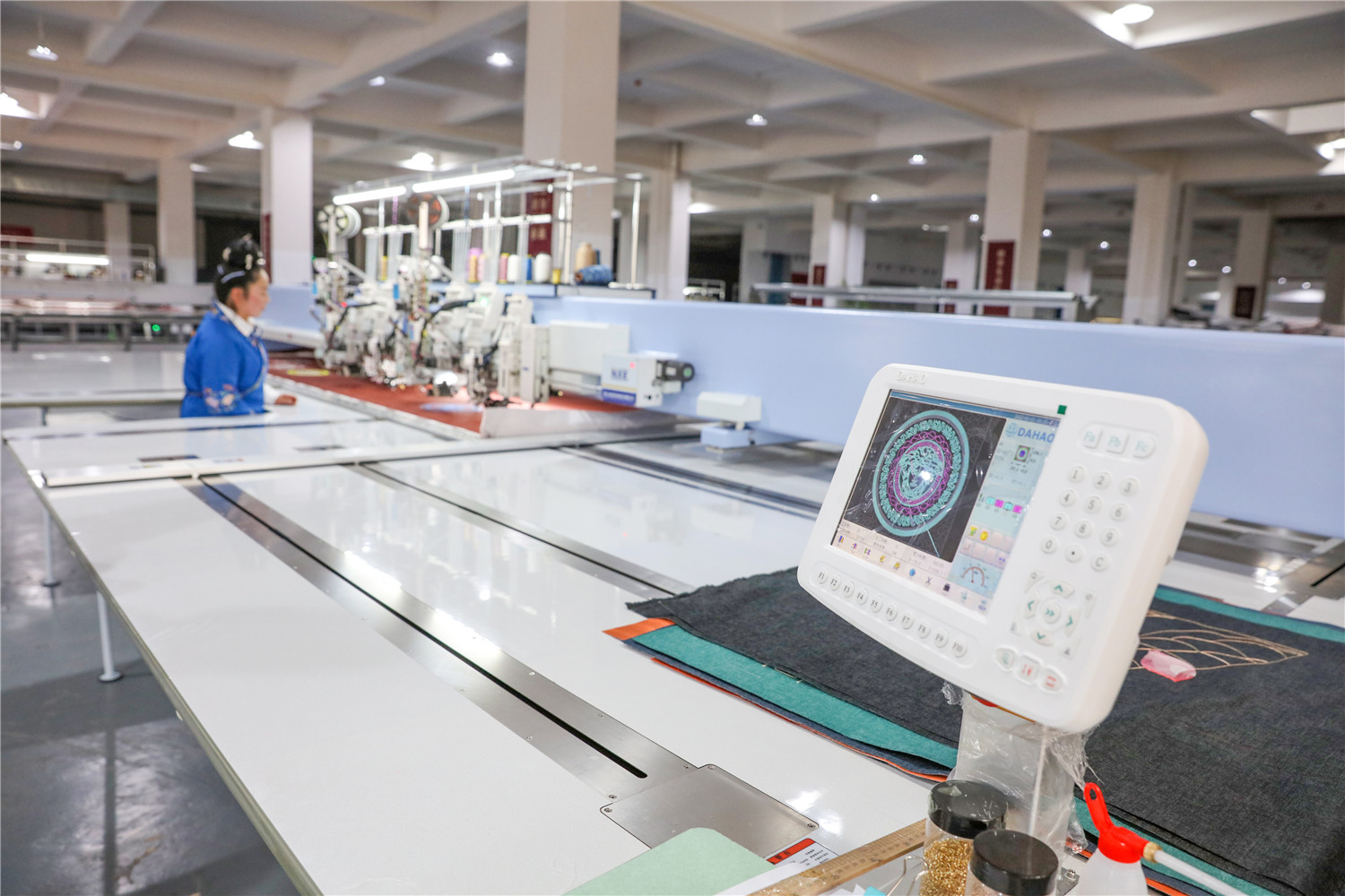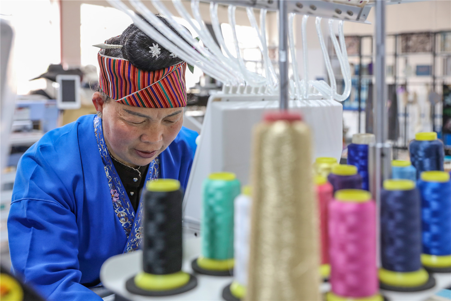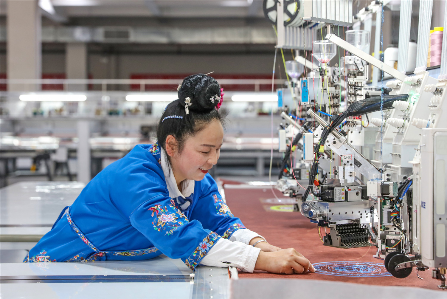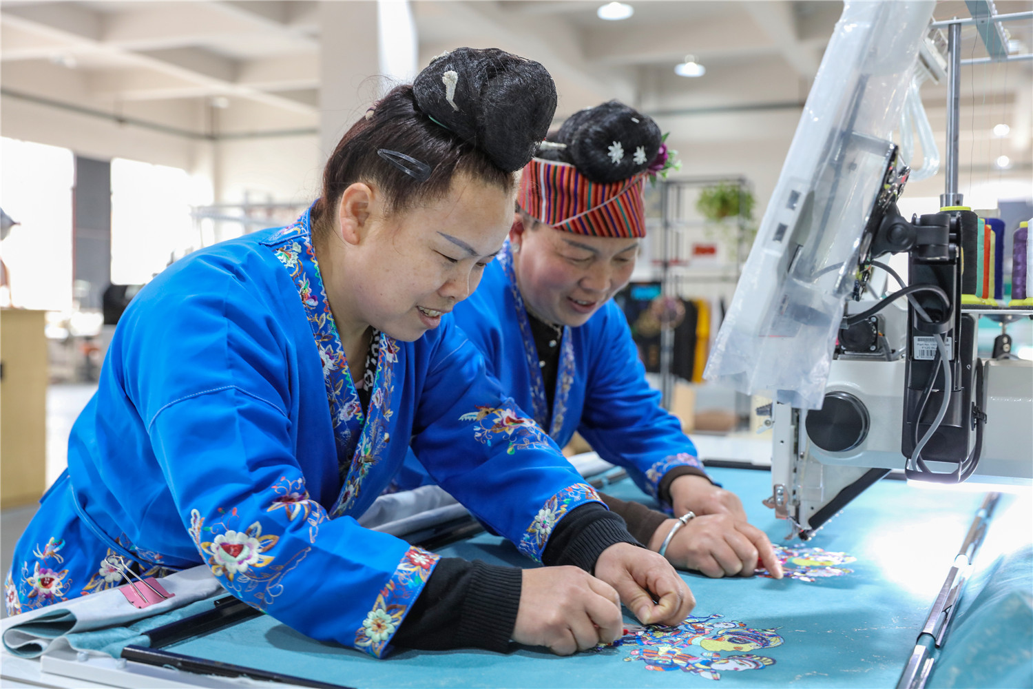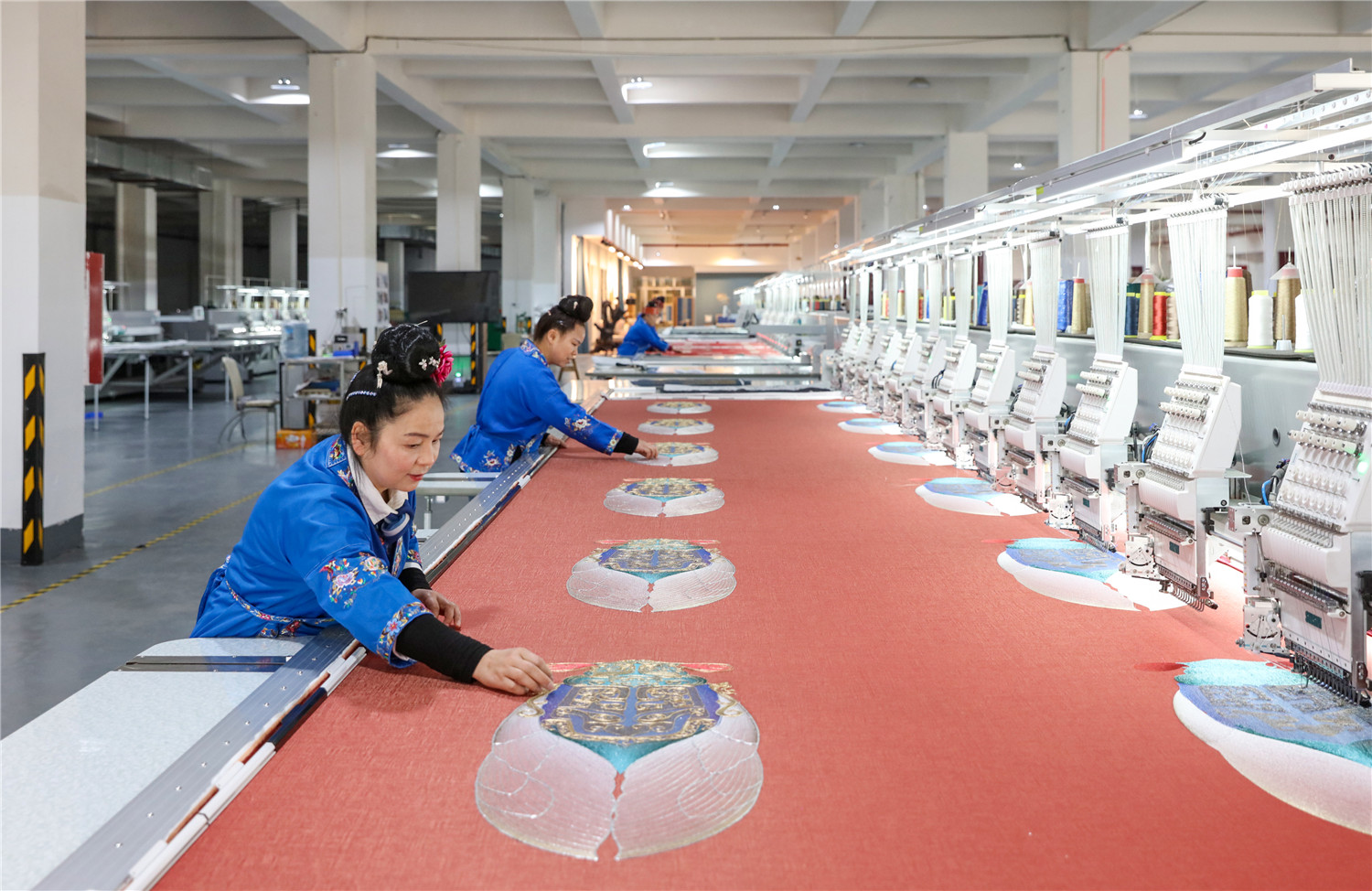 2022年3月15日,贵州省黔东南苗族侗族自治州施秉县特色苗族刺绣产业园的绣娘们在机绣车间作业。(磨桂宾 摄)