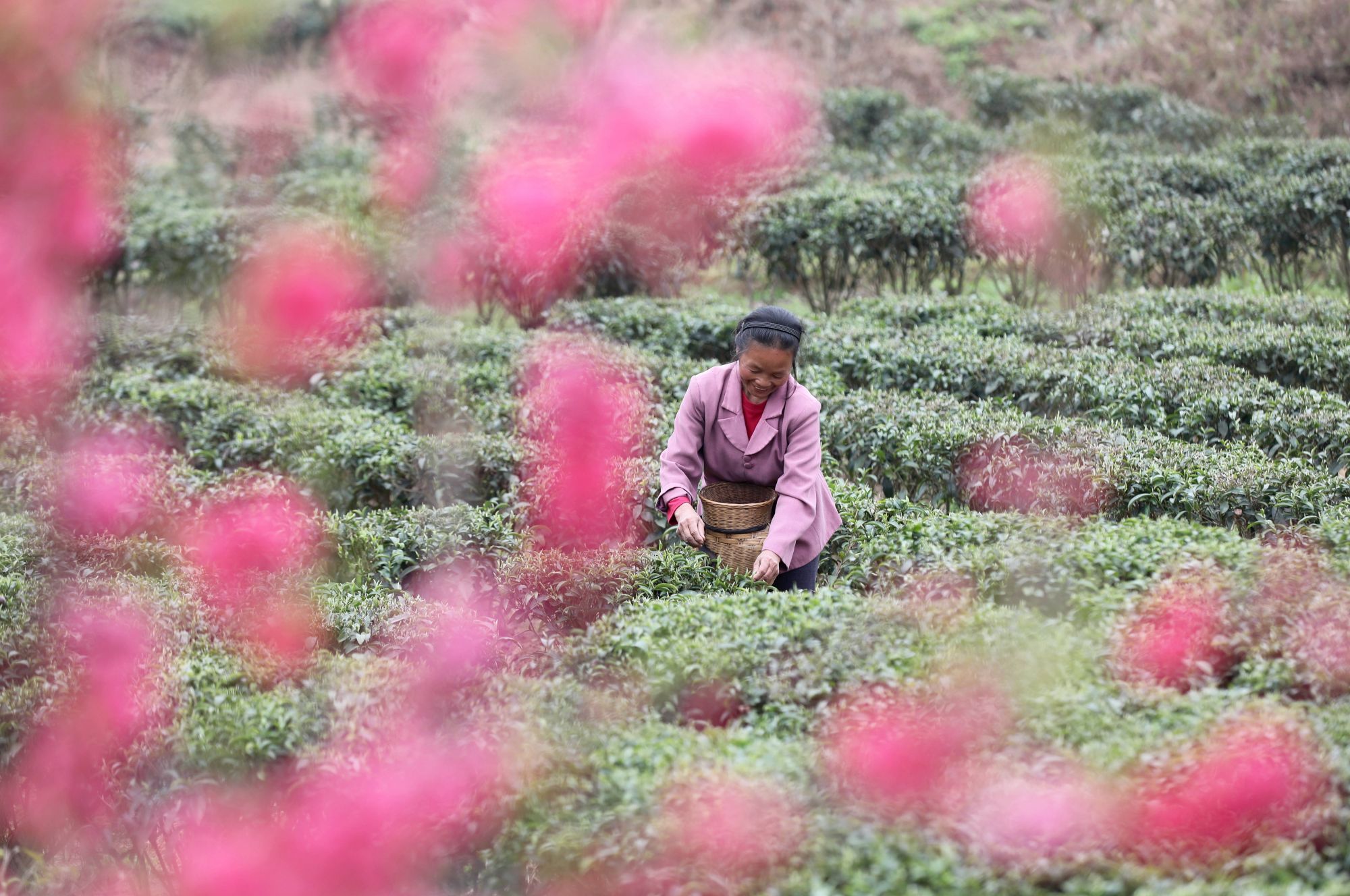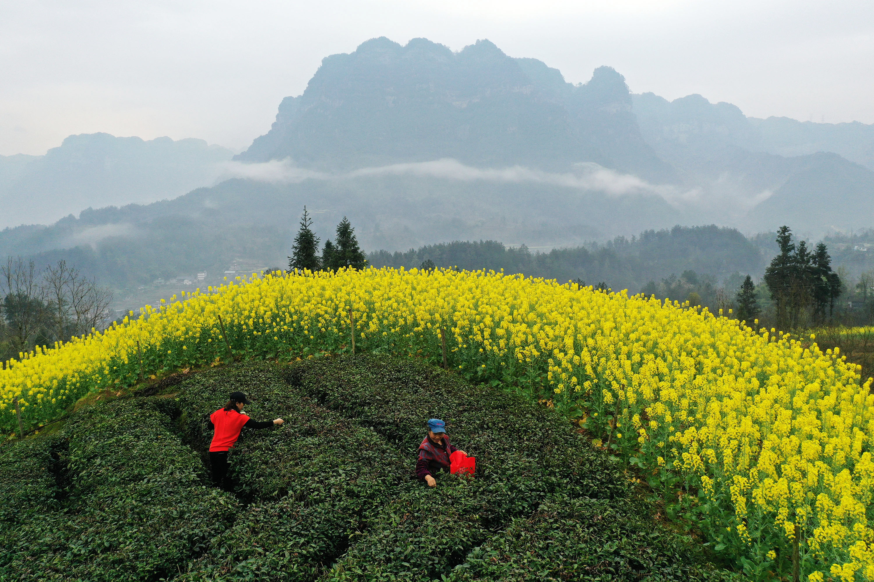 ↑ 游客在宣恩县彭家寨古吊脚楼前赏花游玩。