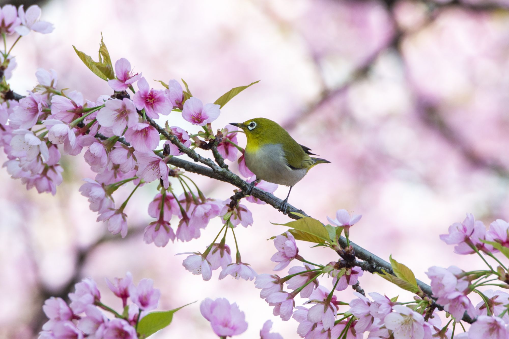 ↑ 一只绣眼鸟在江苏无锡太湖鼋头渚景区的樱花枝头上小憩。