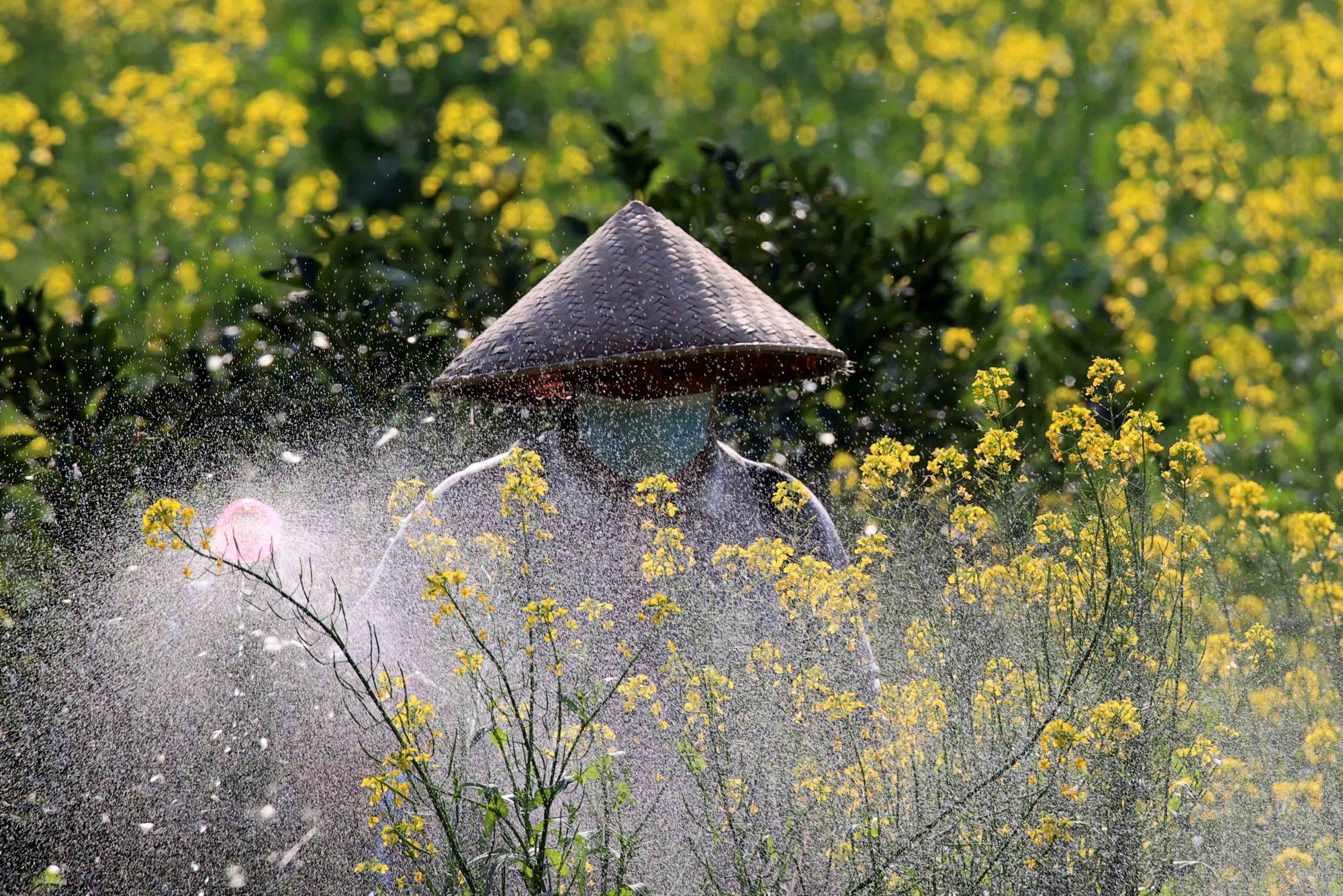 ↑ 在广西柳州市融安县浮石镇东江村,农民在田间管护农作物。