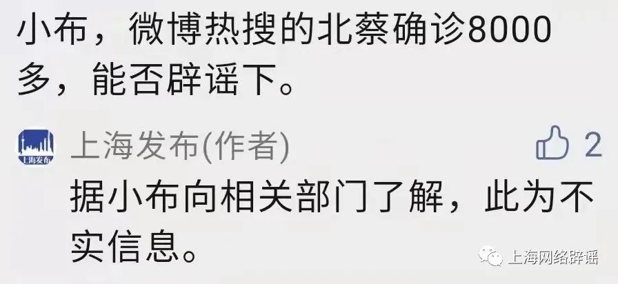 3月22日上午,有网友在上海发布评论区询问:北蔡确诊8000多,能否辟谣下?对此,上海发布回复:据小布向相关部门了解,此为不实消息。