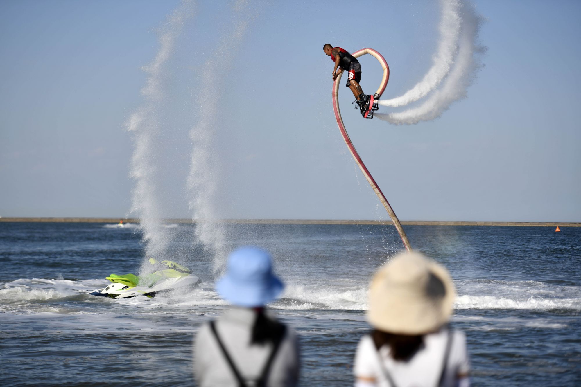 2021年6月5日,游客在天津市滨海新区东疆港人工沙滩观看水上特技表演 ( 赵子硕/摄 )
