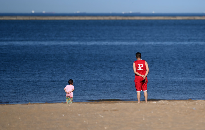 2021年6月5日,在天津市滨海新区东疆港人工沙滩,家长和小朋友一起背手望向大海(李然/摄)