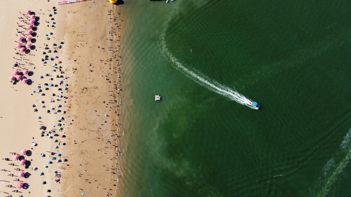 2021年6月5日,游客在天津市滨海新区东疆港人工沙滩游玩(无人机照片,赵子硕/摄)