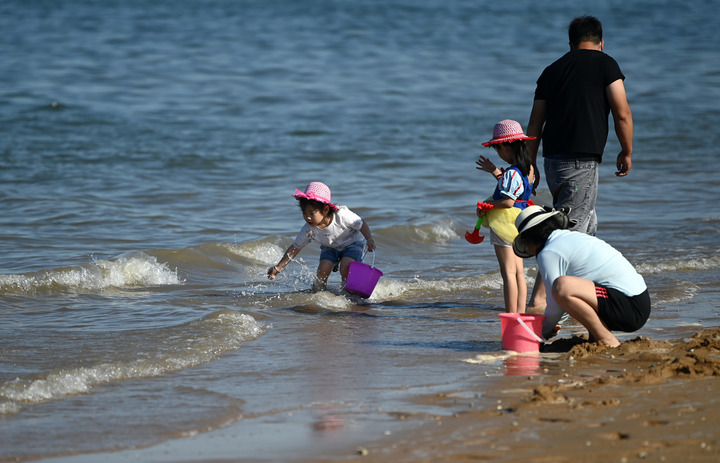 2021年6月5日,在天津市滨海新区东疆港人工沙滩,小朋友在家长的陪伴下“赶海拾贝”(李然/摄)