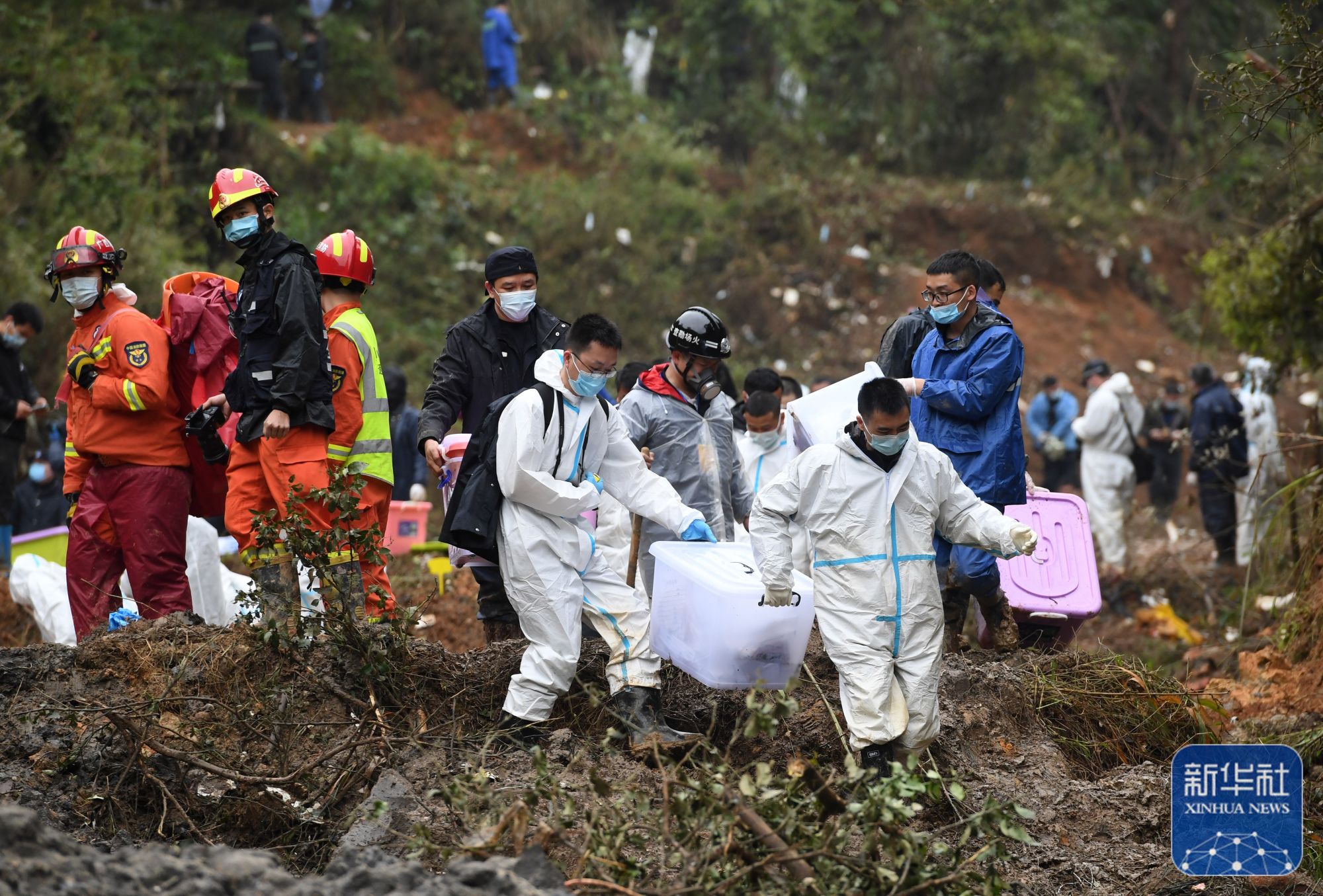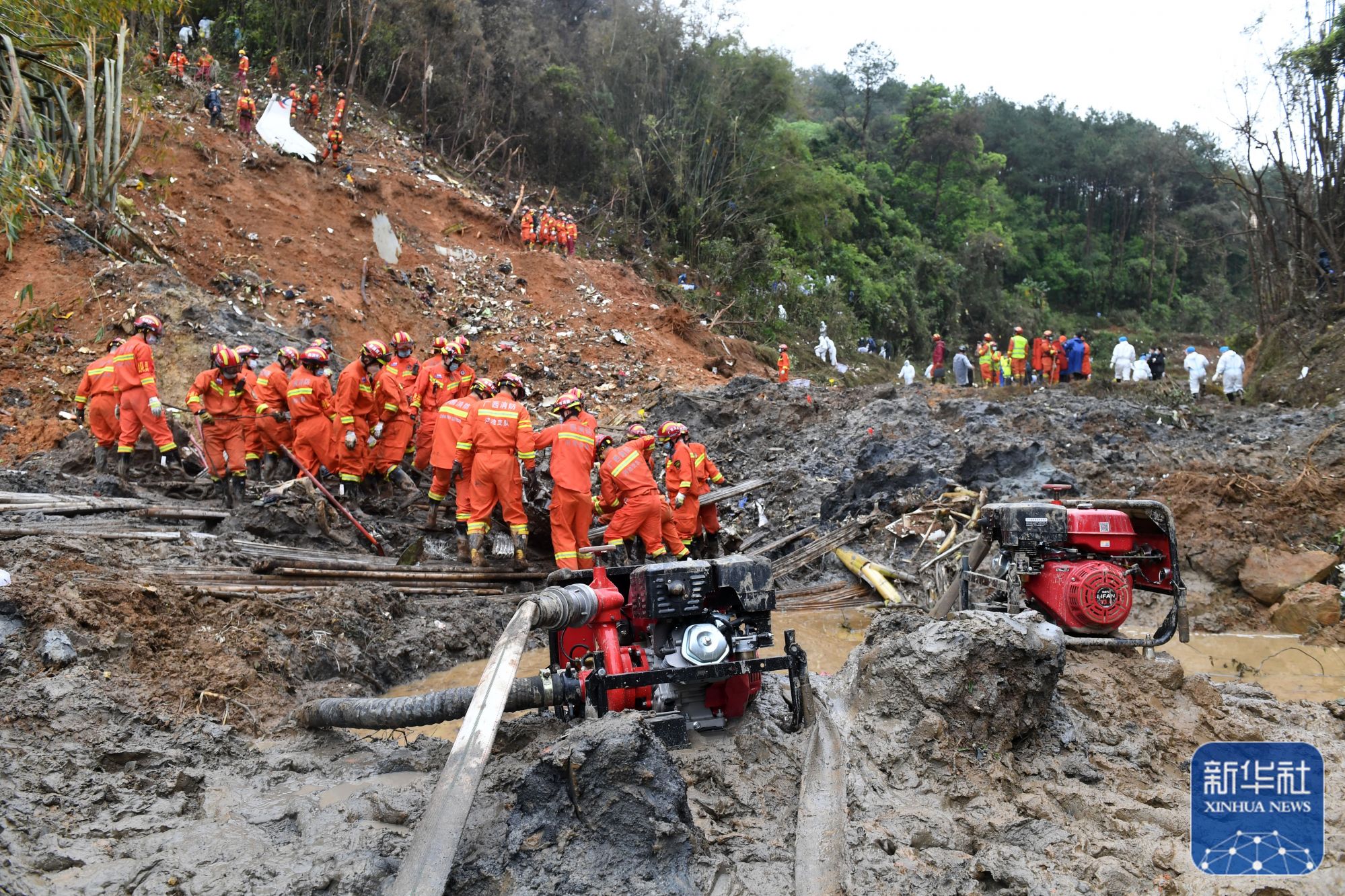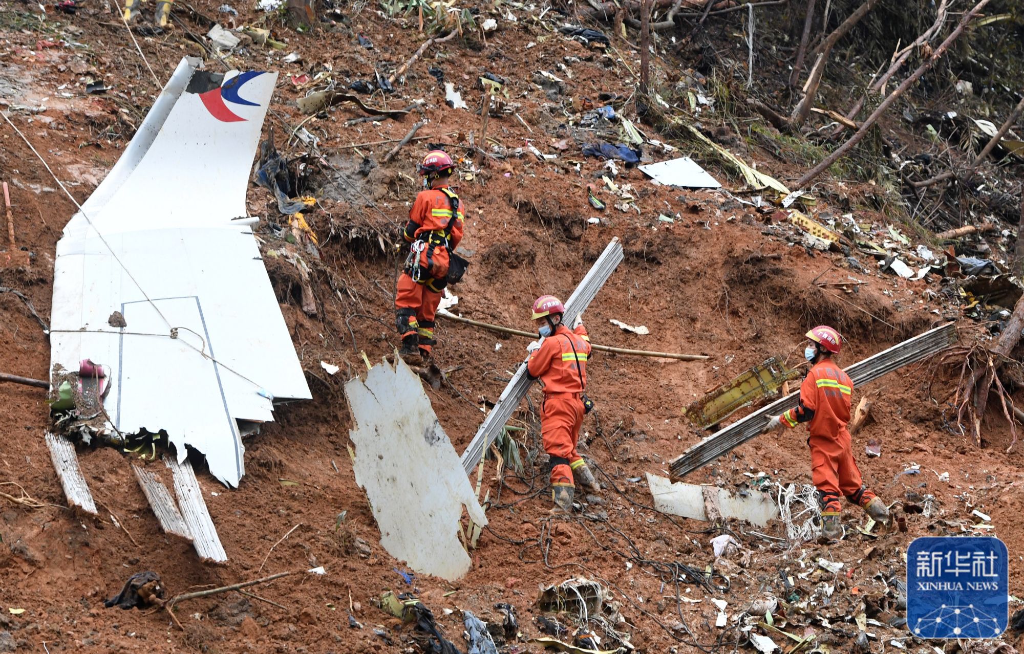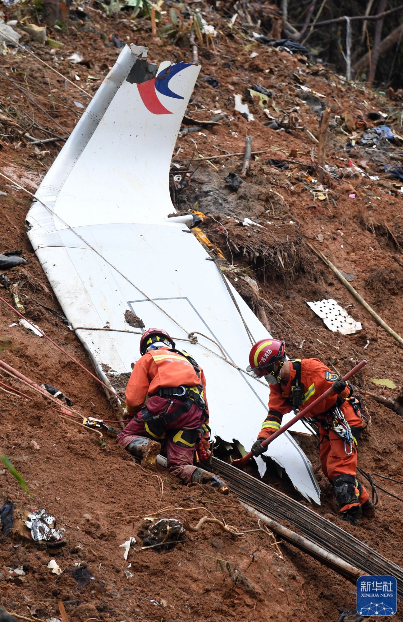 ↑3月24日,搜救人员在事故核心现场继续进行搜索工作。