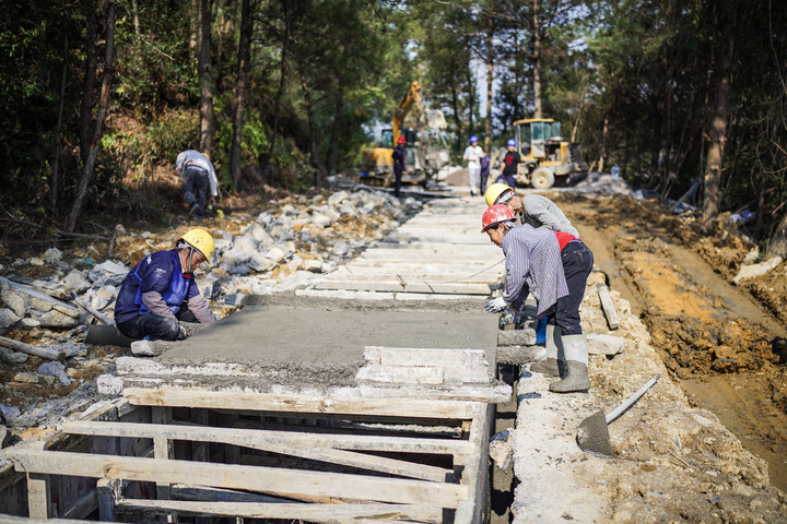 工人在贵州省惠水县雅水镇修建农村水渠(3月16日摄)。新华社记者 陶亮 摄