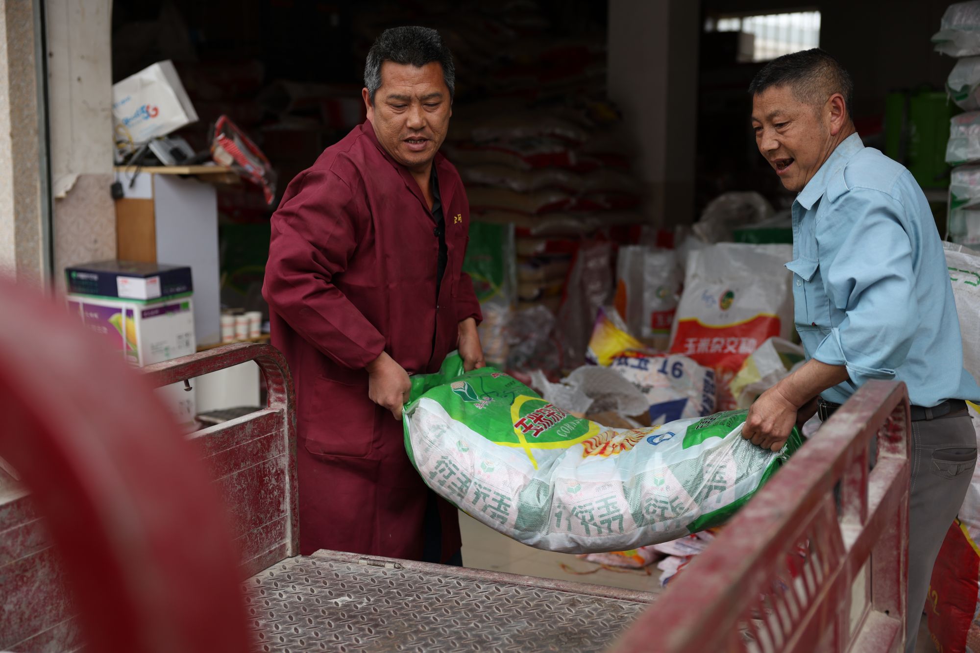 云南省曲靖市会泽县农资销售人员把群众购买的玉米种子装车。新华社发(李荣山 摄)