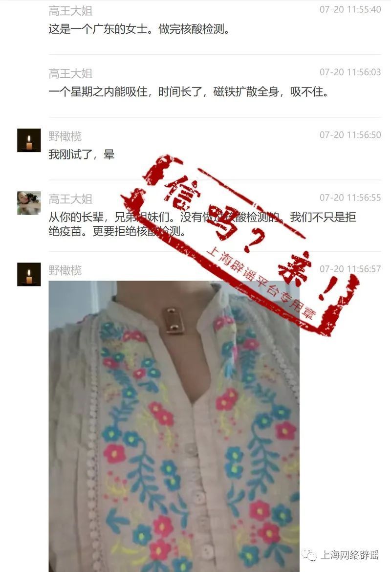 近日,多条“做完核酸检测身体变磁铁”的消息在微信群中流传,有的称“一名广东的女士做完核酸检测一个星期之内,身体能吸住金属”,还有的称“做完核酸检测一个月可以吸住金属”。相关消息中还有图片和视频。